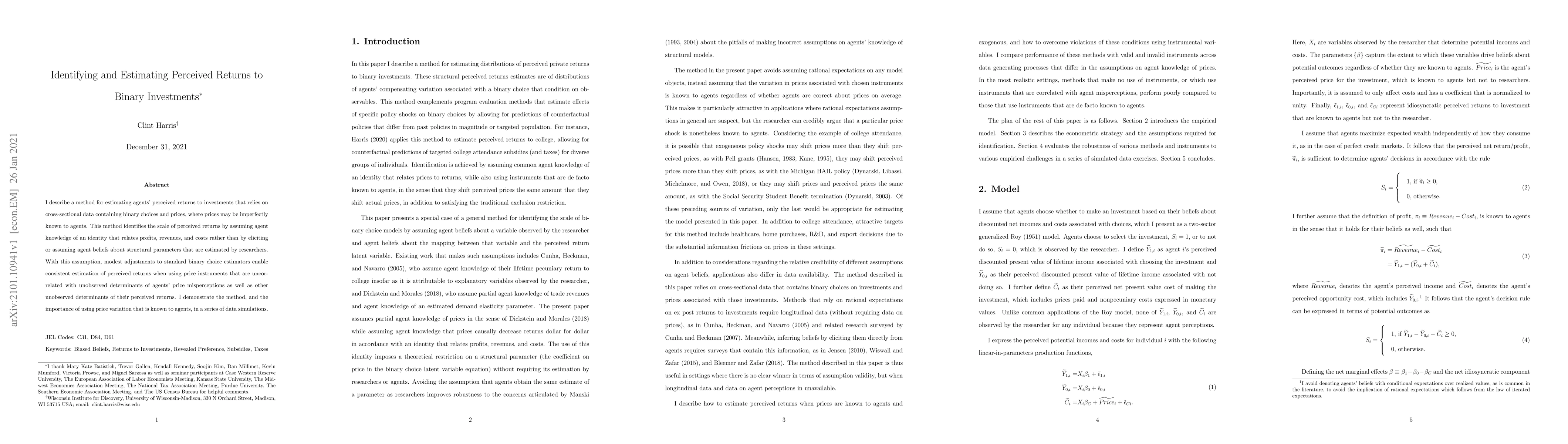 This paper proposes a method for estimating agents' perceived returns on binary investments using cross-sectional data, focusing on identifying the scale of perceived returns through an identity relating profits, revenues, and costs. It demonstrates consistent estimation through modest adjustments to binary choice models, emphasizing the importance of using price variation known to agents.