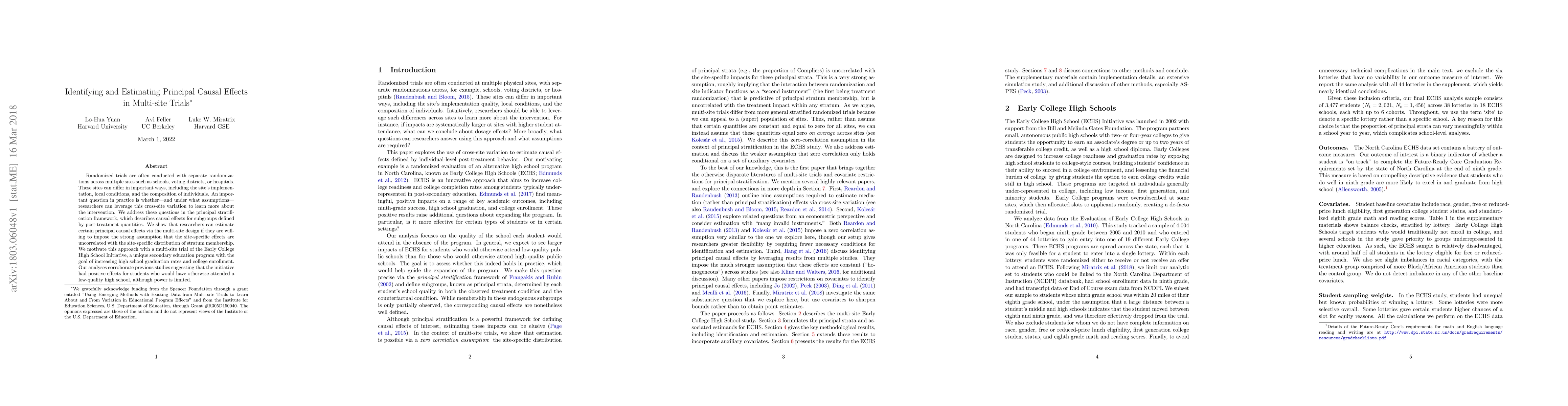 Randomized trials are often conducted with separate randomizations across multiple sites such as schools, voting districts, or hospitals. These sites can differ in important ways, including the site's implementation, local conditions, and the composition of individuals. An important question in practice is whether---and under what assumptions---researchers can leverage this cross-site variation to learn more about the intervention. We address these questions in the principal stratification framework, which describes causal effects for subgroups defined by post-treatment quantities. We show that researchers can estimate certain principal causal effects via the multi-site design if they are willing to impose the strong assumption that the site-specific effects are uncorrelated with the site-specific distribution of stratum membership. We motivate this approach with a multi-site trial of the Early College High School Initiative, a unique secondary education program with the goal of increasing high school graduation rates and college enrollment. Our analyses corroborate previous studies suggesting that the initiative had positive effects for students who would have otherwise attended a low-quality high school, although power is limited.