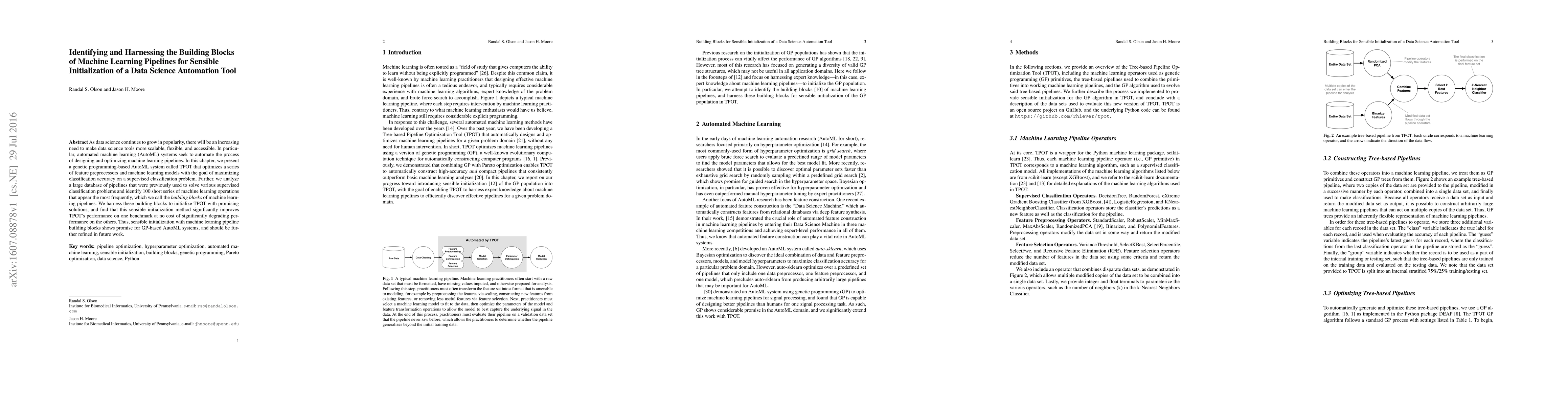 This paper introduces TPOT, a genetic programming-based AutoML system that optimizes machine learning pipelines for classification tasks. It identifies 100 frequently occurring "building blocks" from a large database of previous pipelines, using these to initialize TPOT, which significantly enhances its performance on one benchmark.