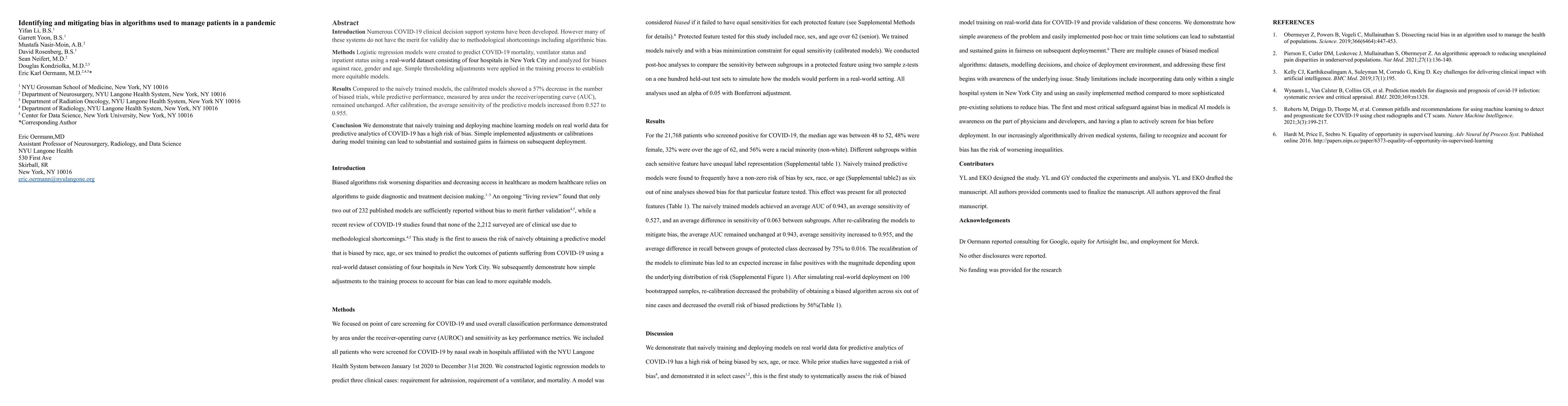 Algorithms used to manage COVID-19 patients can be biased against certain groups, but simple adjustments during training can significantly improve fairness and accuracy. Calibration of machine learning models reduces bias without compromising predictive performance.