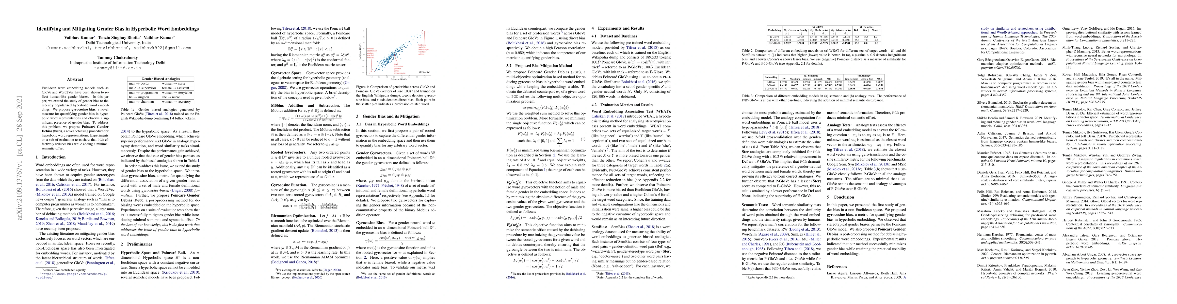 This paper investigates gender bias in hyperbolic word embeddings, introducing gyrocosine bias to measure it and proposing Poincar\'e Gender Debias (PGD) to mitigate it. Experiments demonstrate that PGD reduces bias with minimal impact on semantic quality.