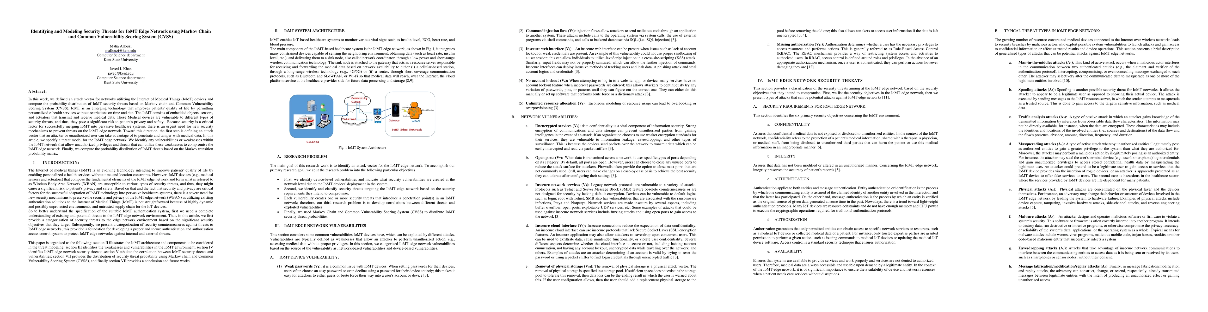 This paper defines an attack vector for Internet of Medical Things (IoMT) networks and uses Markov chains and the Common Vulnerability Scoring System (CVSS) to model and compute the probability distribution of security threats, aiming to enhance security mechanisms for IoMT edge networks. The study identifies vulnerabilities within IoMT devices and proposes a threat model to mitigate risks to patient privacy and safety.
