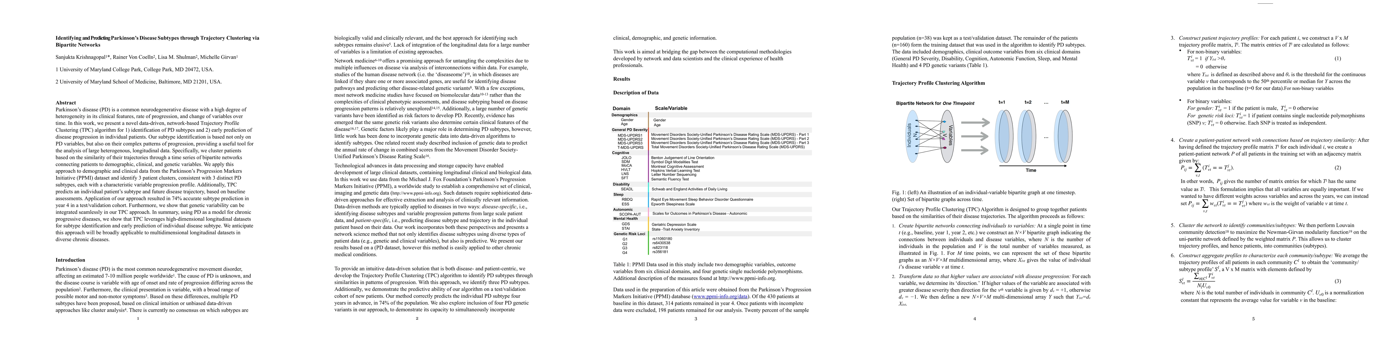 This paper introduces a novel Trajectory Profile Clustering (TPC) algorithm for identifying Parkinson's Disease (PD) subtypes and predicting disease progression. The approach uses bipartite networks to cluster patient trajectories based on demographic, clinical, and genetic variables, identifying three distinct PD subtypes with characteristic progression profiles.