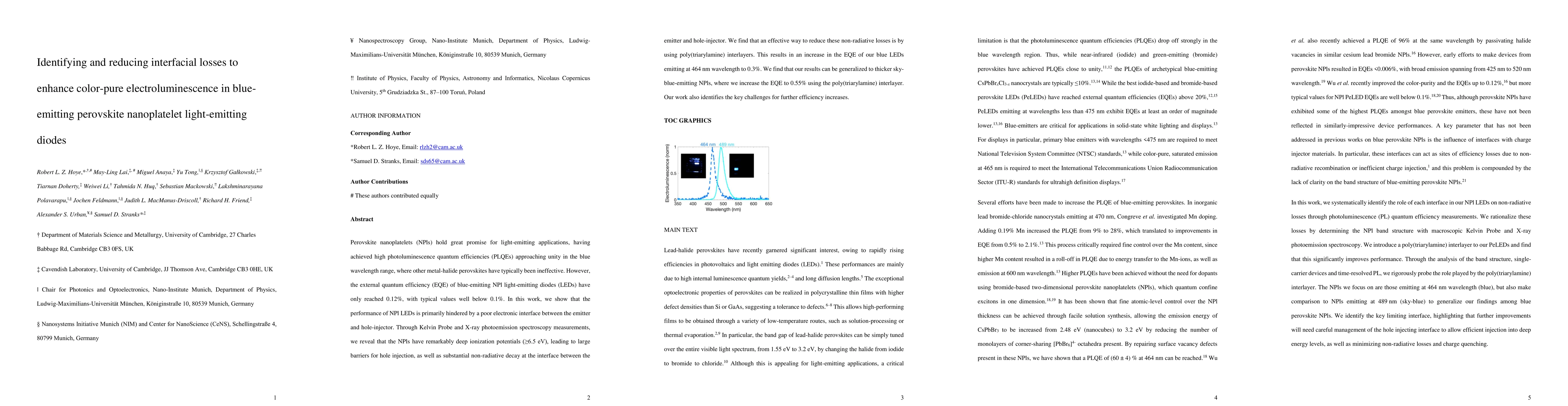 This paper investigates the low external quantum efficiency (EQE) of blue-emitting perovskite nanoplatelet LEDs, attributing it to large barriers for hole injection and non-radiative decay at the interface. The use of poly(triarylamine) interlayers reduces these losses, significantly boosting the EQE of blue LEDs to 0.3% and sky-blue LEDs to 0.55%.
