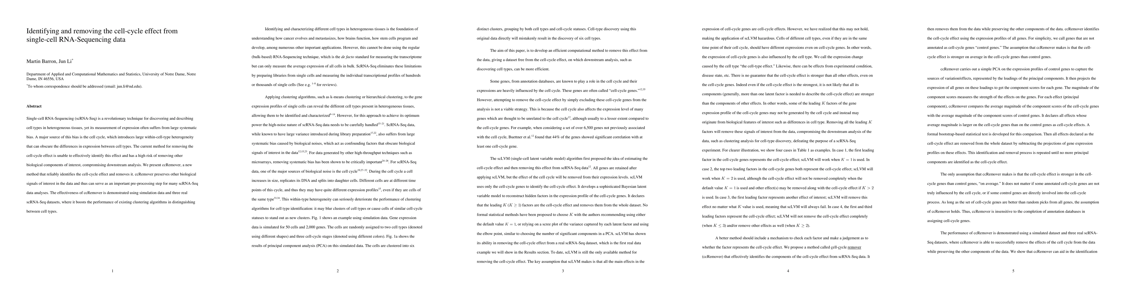The paper introduces ccRemover, a novel method for identifying and removing cell-cycle effects from single-cell RNA-sequencing data, thereby preserving other biological signals and enhancing downstream analyses. Demonstrated through simulations and real datasets, ccRemover improves clustering performance in distinguishing cell types.