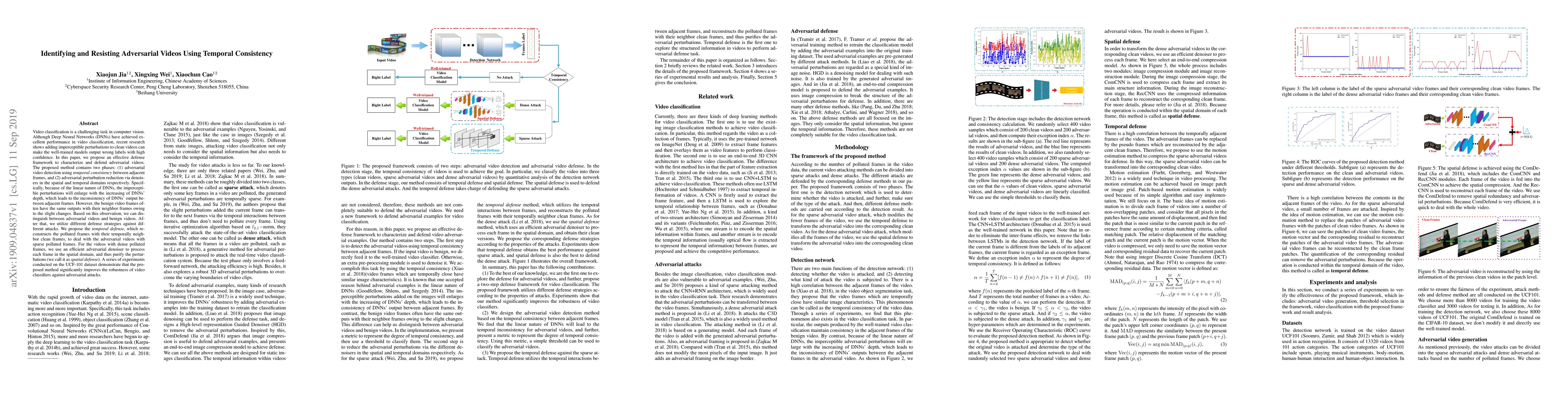 This paper proposes a defense framework to identify and mitigate adversarial videos by leveraging temporal consistency between frames. It includes two phases: detecting adversarial videos through temporal inconsistency and reducing adversarial perturbations using spatial and temporal denoisers. Experiments on the UCF-101 dataset show significant improvements in video classifier robustness against adversarial attacks.