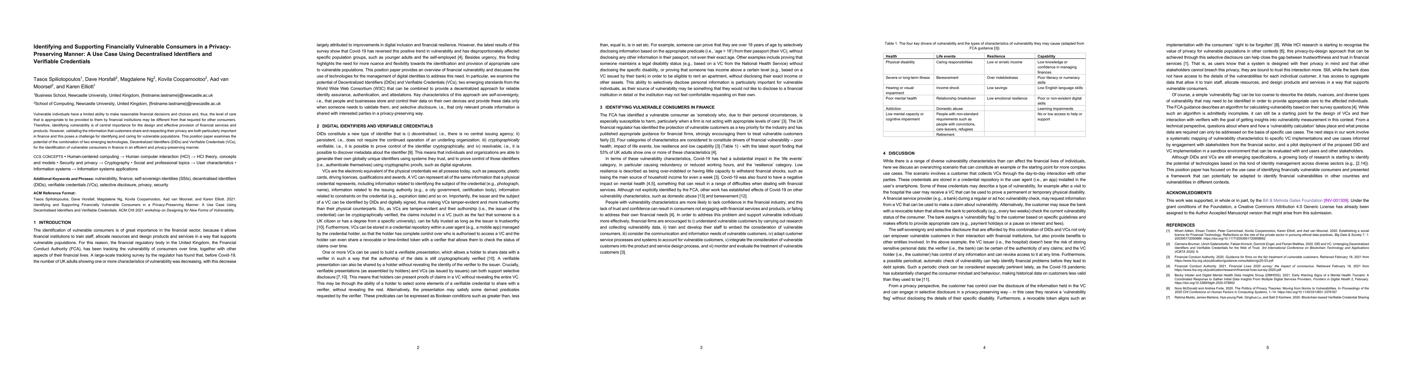 This paper explores the use of Decentralized Identifiers (DIDs) and Verifiable Credentials (VCs) to identify financially vulnerable consumers while ensuring privacy. It highlights the importance of protecting customer information and respecting privacy in financial services.