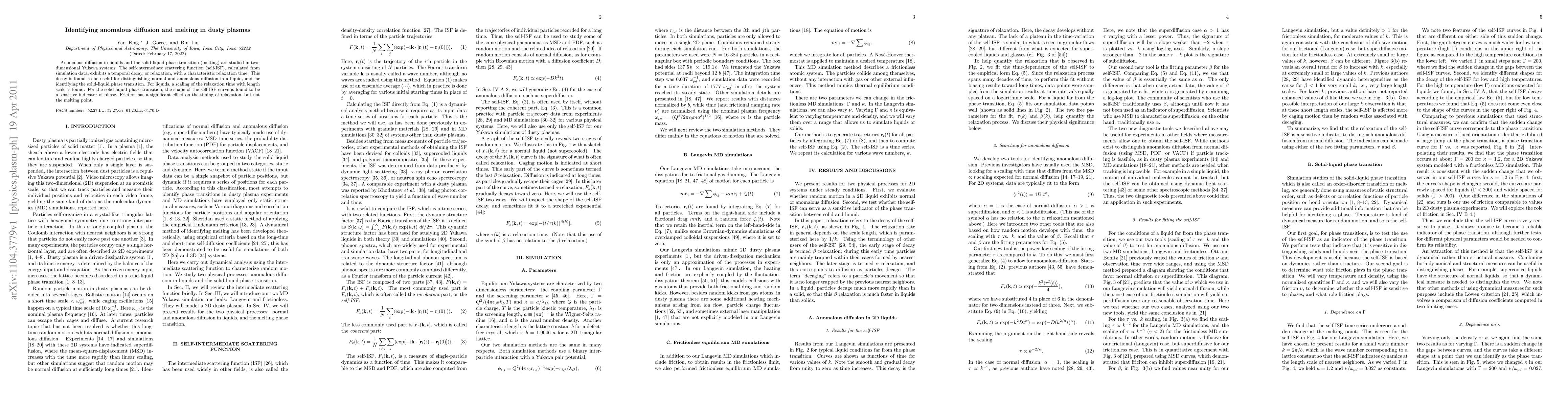 This paper investigates anomalous diffusion and melting in two-dimensional dusty plasmas using simulation data. The self-intermediate scattering function reveals temporal decay useful for distinguishing diffusion types and identifying phase transitions, with friction affecting relaxation timing but not the melting point.