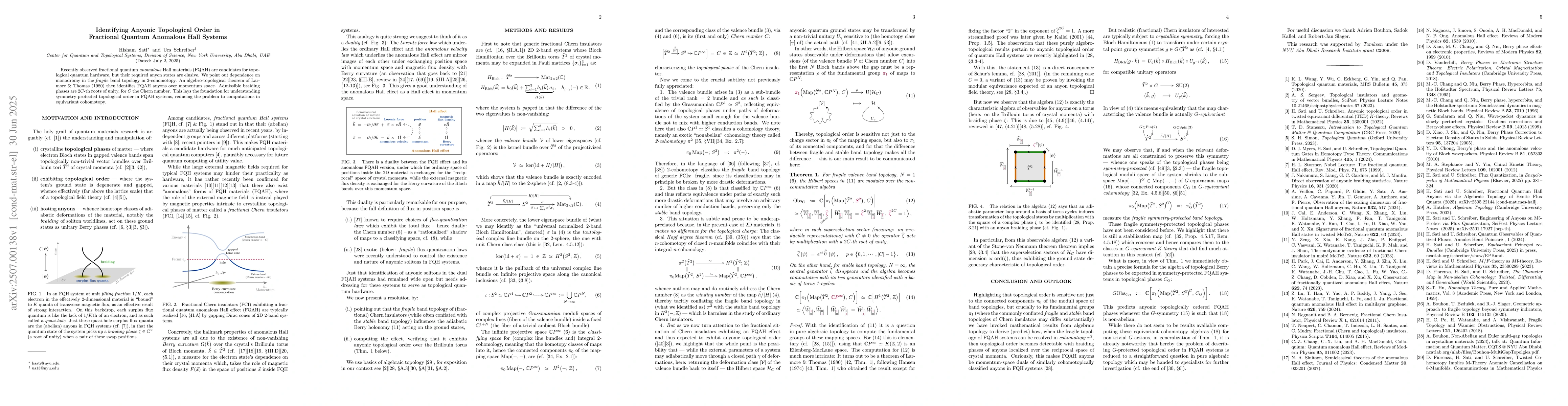 The paper identifies anyonic topological order in fractional quantum anomalous Hall systems, linking fragile band topology with monodromy and applying a 1980 theorem by Larmore & Thomas. It establishes that braiding phases are 2C-th roots of unity, where C is the Chern number, providing a foundation for understanding symmetry-protected topological order in these systems.