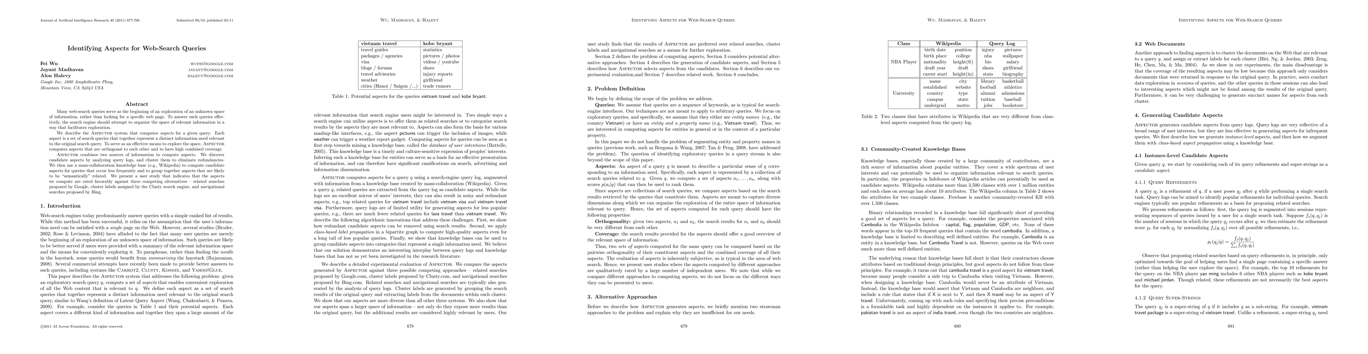 A research paper introduces Aspector, a system that identifies aspects for web-search queries to facilitate exploration of unknown information spaces. It finds favorable user ratings compared to competing alternatives like Google's related searches and Bing's navigational searches.