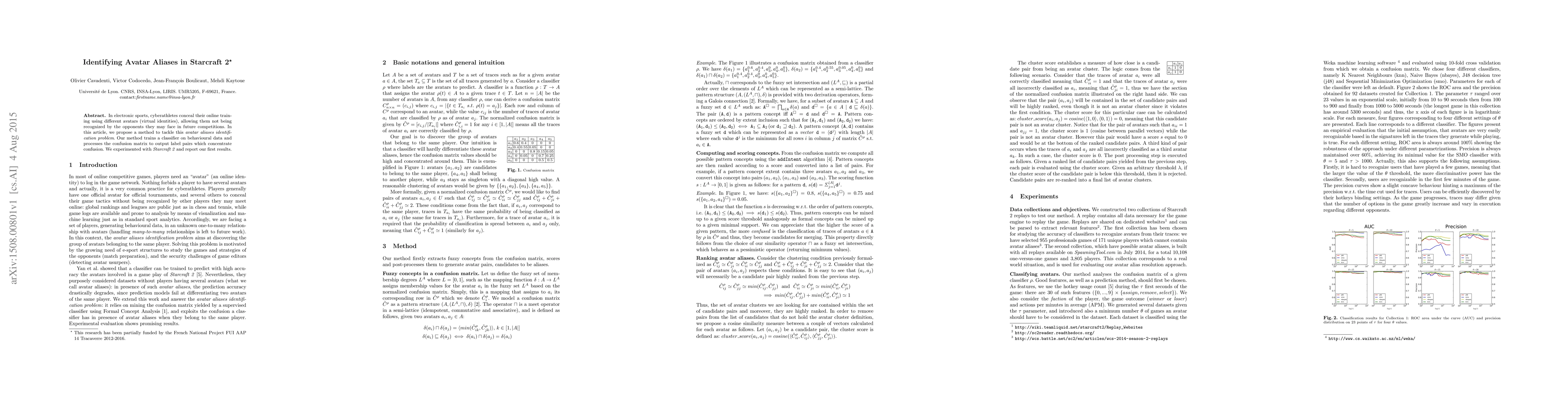 Researchers developed a method to identify avatar aliases in Starcraft 2 games, allowing opponents to recognize cyberathletes' online training identities. The approach uses behavioral data and confusion matrix analysis to output labels that highlight suspicious patterns.