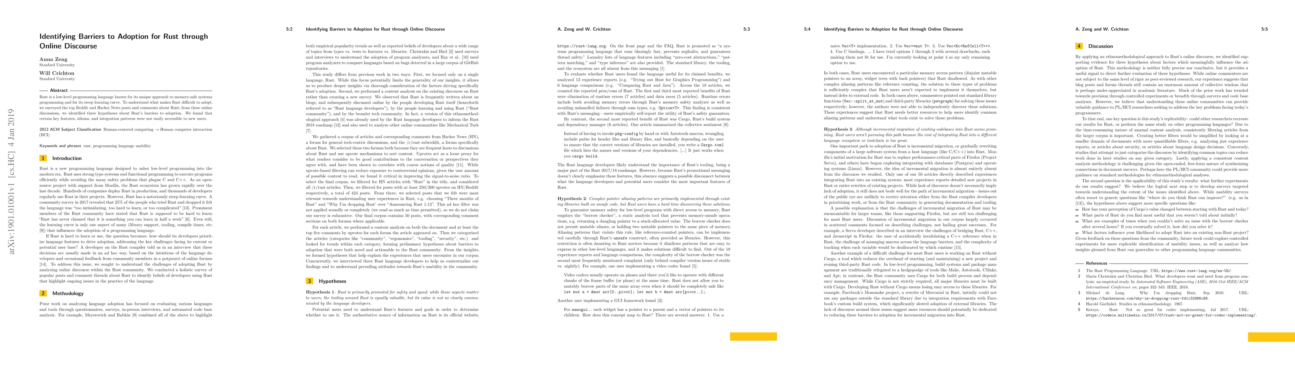 Rust is a low-level programming language known for its unique approach to memory-safe systems programming and for its steep learning curve. To understand what makes Rust difficult to adopt, we surveyed the top Reddit and Hacker News posts and comments about Rust; from these online discussions, we identified three hypotheses about Rust's barriers to adoption. We found that certain key features, idioms, and integration patterns were not easily accessible to new users.