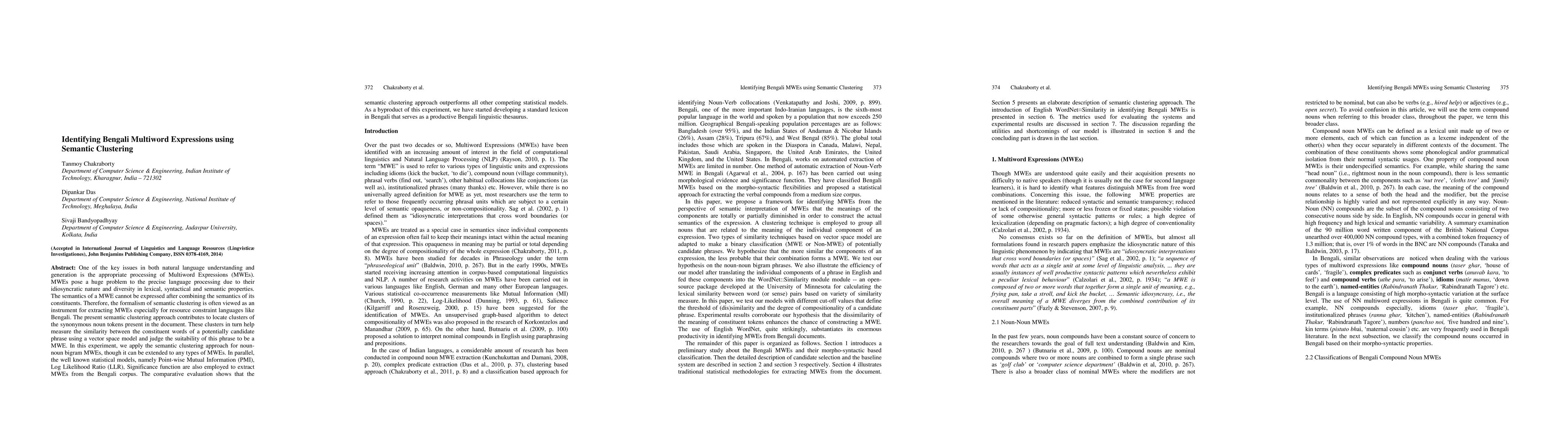 This paper proposes a semantic clustering approach to identify Bengali Multiword Expressions (MWEs), demonstrating its effectiveness over statistical models like PMI and LLR. The method clusters synonymous noun tokens to measure phrase similarity, outperforming traditional statistical extraction methods.