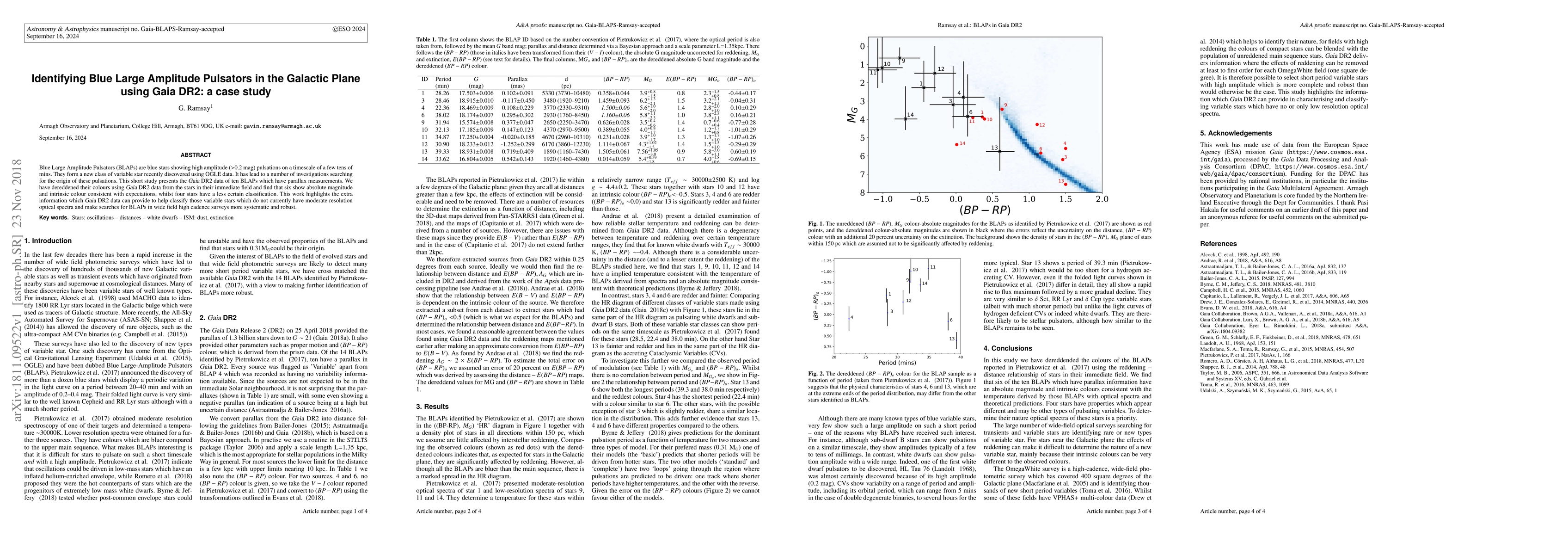 This study identifies ten Blue Large Amplitude Pulsators (BLAPs) in the Galactic Plane using Gaia DR2 data, finding six consistent with expected properties and four with uncertain classifications. Gaia DR2 data enhances the classification of variable stars lacking moderate resolution optical spectra.