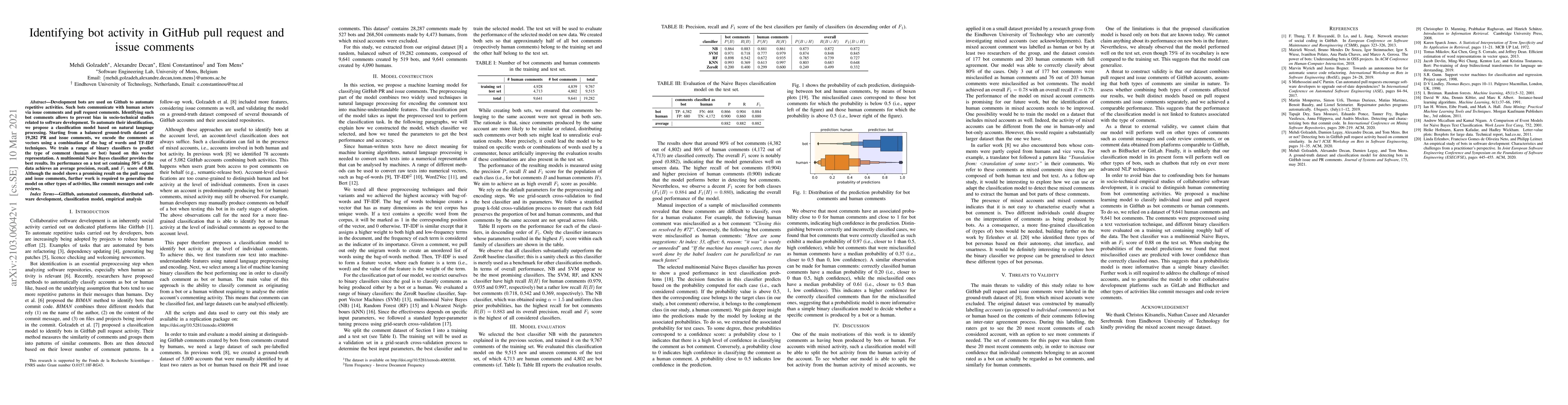 The paper presents a text classification model using Naive Bayes that effectively distinguishes between human-written and bot-generated comments on GitHub, achieving an F1 score of 0.88.