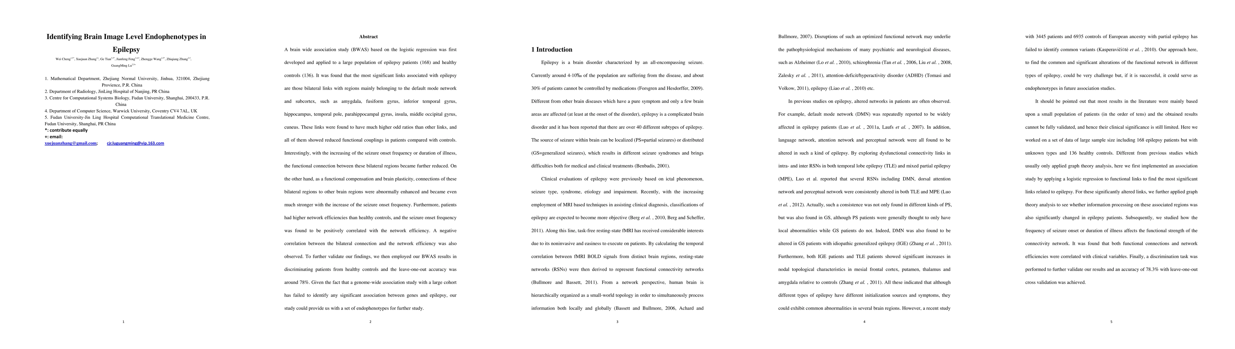 A brain wide association study (BWAS) based on the logistic regression was first developed and applied to a large population of epilepsy patients (168) and healthy controls (136). It was found that the most significant links associated with epilepsy are those bilateral links with regions mainly belonging to the default mode network and subcortex, such as amygdala, fusiform gyrus, inferior temporal gyrus, hippocampus, temporal pole, parahippocampal gyrus, insula, middle occipital gyrus, cuneus. These links were found to have much higher odd ratios than other links, and all of them showed reduced functional couplings in patients compared with controls. Interestingly, with the increasing of the seizure onset frequency or duration of illness, the functional connection between these bilateral regions became further reduced. On the other hand, as a functional compensation and brain plasticity, connections of these bilateral regions to other brain regions were abnormally enhanced and became even much stronger with the increase of the seizure onset frequency. Furthermore, patients had higher network efficiencies than healthy controls, and the seizure onset frequency was found to be positively correlated with the network efficiency. A negative correlation between the bilateral connection and the network efficiency was also observed. To further validate our findings, we then employed our BWAS results in discriminating patients from healthy controls and the leave-one-out accuracy was around 78%. Given the fact that a genome-wide association study with a large cohort has failed to identify any significant association between genes and epilepsy, our study could provide us with a set of endophenotypes for further study.