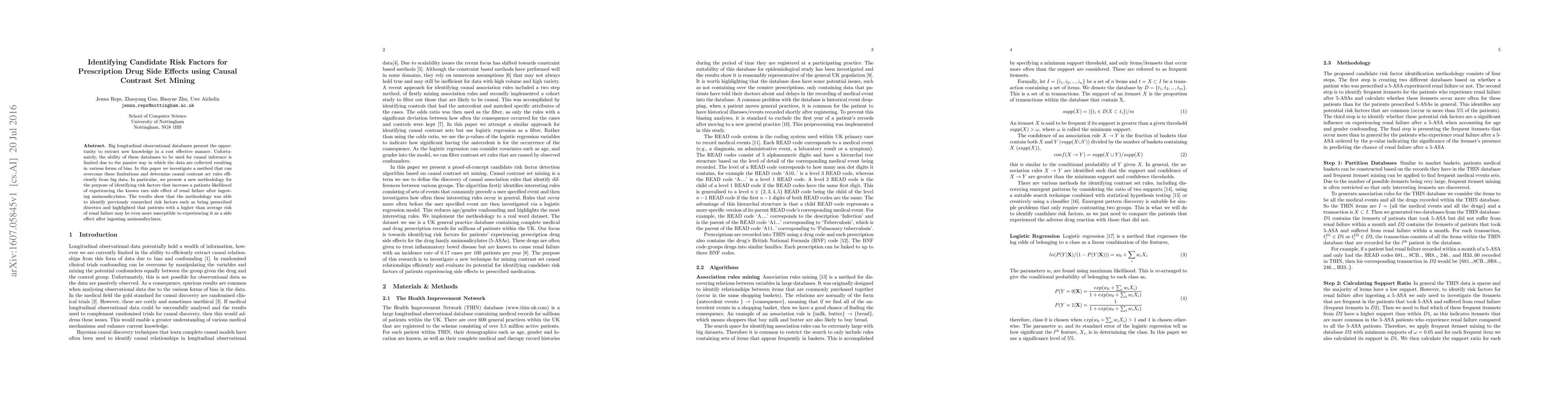 Big longitudinal observational databases present the opportunity to extract new knowledge in a cost effective manner. Unfortunately, the ability of these databases to be used for causal inference is limited due to the passive way in which the data are collected resulting in various forms of bias. In this paper we investigate a method that can overcome these limitations and determine causal contrast set rules efficiently from big data. In particular, we present a new methodology for the purpose of identifying risk factors that increase a patients likelihood of experiencing the known rare side effect of renal failure after ingesting aminosalicylates. The results show that the methodology was able to identify previously researched risk factors such as being prescribed diuretics and highlighted that patients with a higher than average risk of renal failure may be even more susceptible to experiencing it as a side effect after ingesting aminosalicylates.