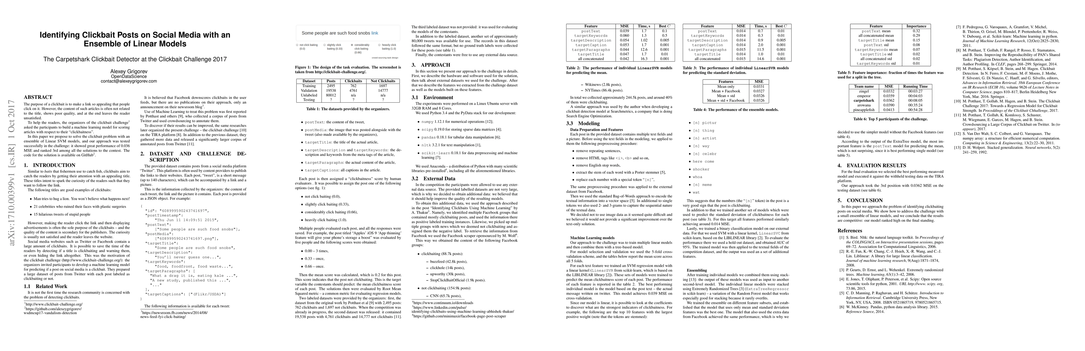 Researchers developed an ensemble of linear models to identify clickbait articles on social media, achieving a performance of 0.036 MSE and ranking 3rd in a challenge, suggesting a promising approach for detecting misleading content.