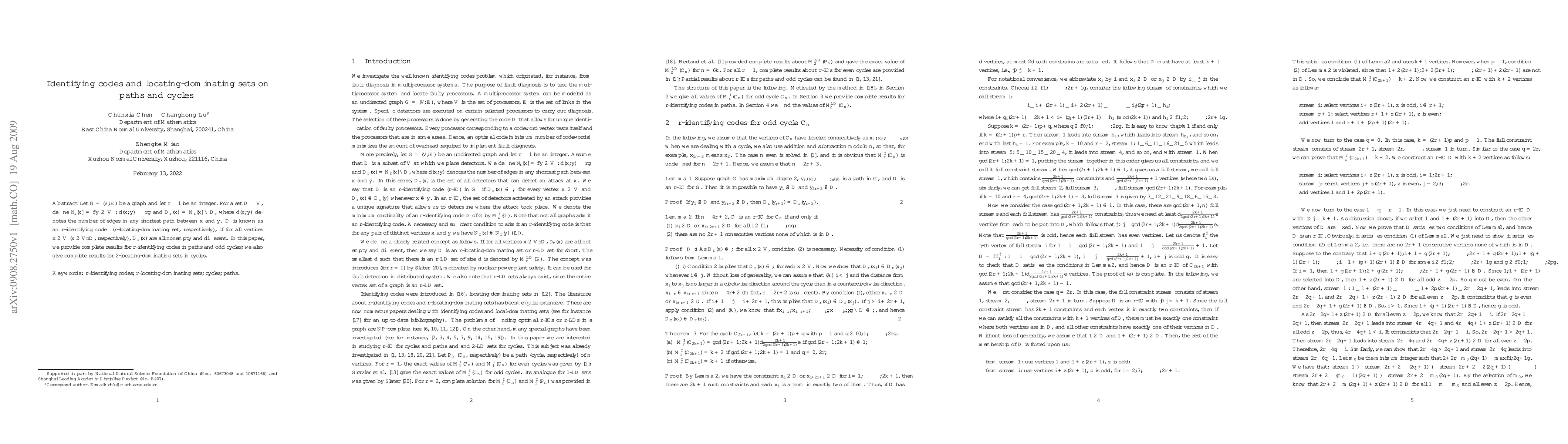 Let $G=(V,E)$ be a graph and let $r\ge 1$ be an integer. For a set $D \subseteq V$, define $N_r[x] = \{y \in V: d(x, y) \leq r\}$ and $D_r(x) = N_r[x] \cap D$, where $d(x,y)$ denotes the number of edges in any shortest path between $x$ and $y$. $D$ is known as an $r$-identifying code ($r$-locating-dominating set, respectively), if for all vertices $x\in V$ ($x \in V\backslash D$, respectively), $D_r(x)$ are all nonempty and different. In this paper, we provide complete results for $r$-identifying codes in paths and odd cycles; we also give complete results for 2-locating-dominating sets in cycles.