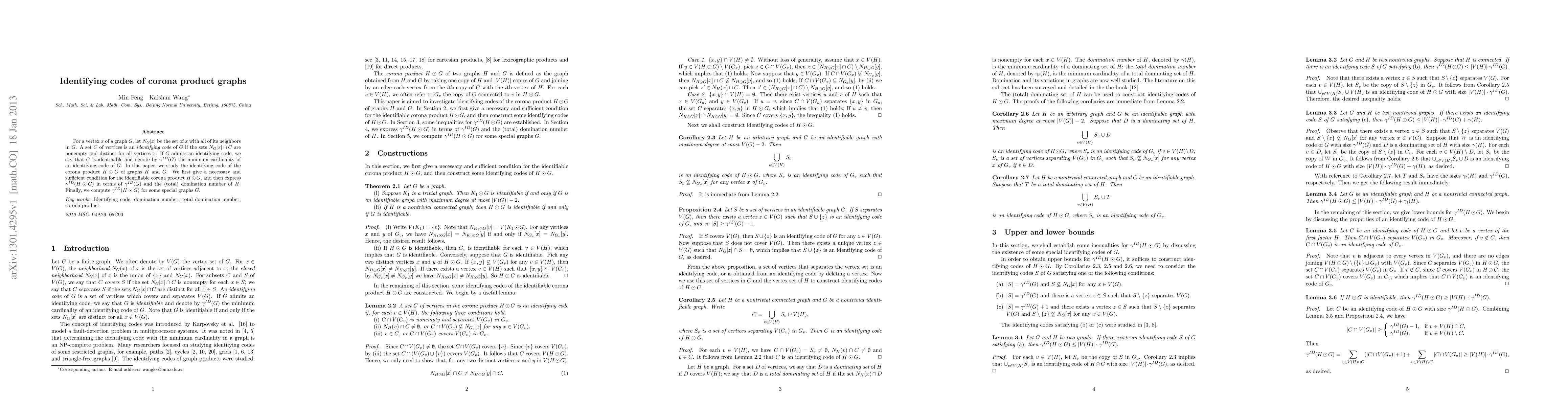 This paper investigates identifying codes in corona product graphs, providing a necessary and sufficient condition for the identifiability of $H\odot G$ and expressing $\gamma^{ID}(H\odot G)$ in terms of $\gamma^{ID}(G)$ and the domination number of $H$. It also computes $\gamma^{ID}(H\odot G)$ for specific graphs.