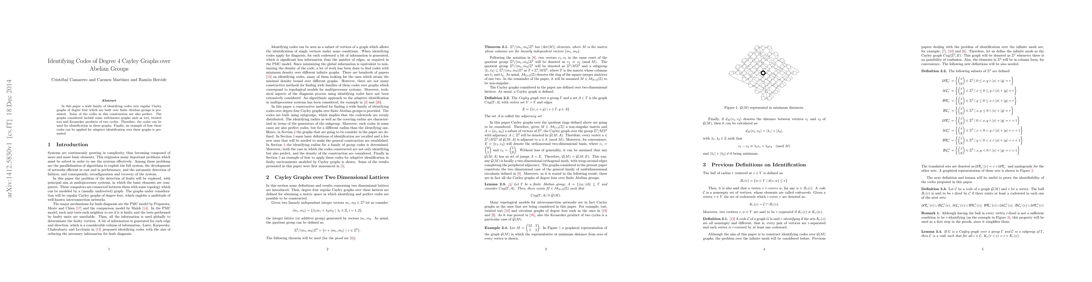 In this paper a wide family of identifying codes over regular Cayley graphs of degree four which are built over finite Abelian groups is presented. Some of the codes in this construction are also perfect. The graphs considered include some well-known graphs such as tori, twisted tori and Kronecker products of two cycles. Therefore, the codes can be used for identification in these graphs. Finally, an example of how these codes can be applied for adaptive identification over these graphs is presented.