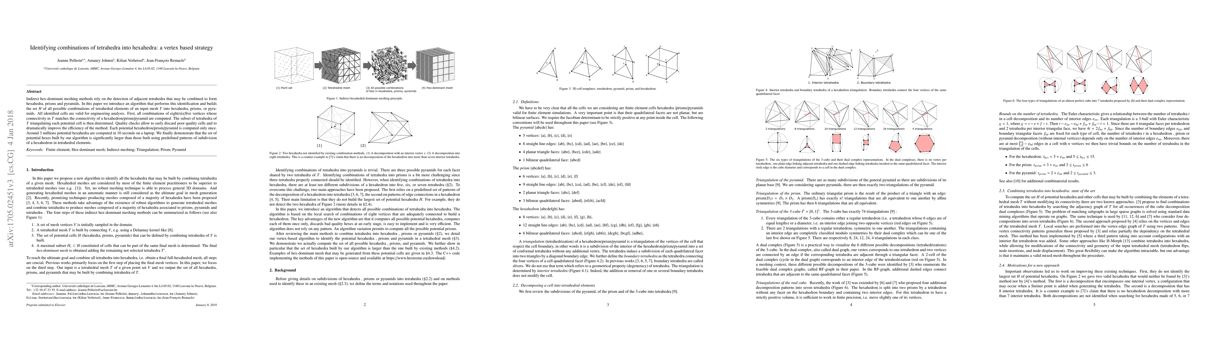 Indirect hex-dominant meshing methods rely on the detection of adjacent tetrahedra an algorithm that performs this identification and builds the set of all possible combinations of tetrahedral elements of an input mesh T into hexahedra, prisms, or pyramids. All identified cells are valid for engineering analysis. First, all combinations of eight/six/five vertices whose connectivity in T matches the connectivity of a hexahedron/prism/pyramid are computed. The subset of tetrahedra of T triangulating each potential cell is then determined. Quality checks allow to early discard poor quality cells and to dramatically improve the efficiency of the method. Each potential hexahedron/prism/pyramid is computed only once. Around 3 millions potential hexahedra are computed in 10 seconds on a laptop. We finally demonstrate that the set of potential hexes built by our algorithm is significantly larger than those built using predefined patterns of subdivision of a hexahedron in tetrahedral elements.