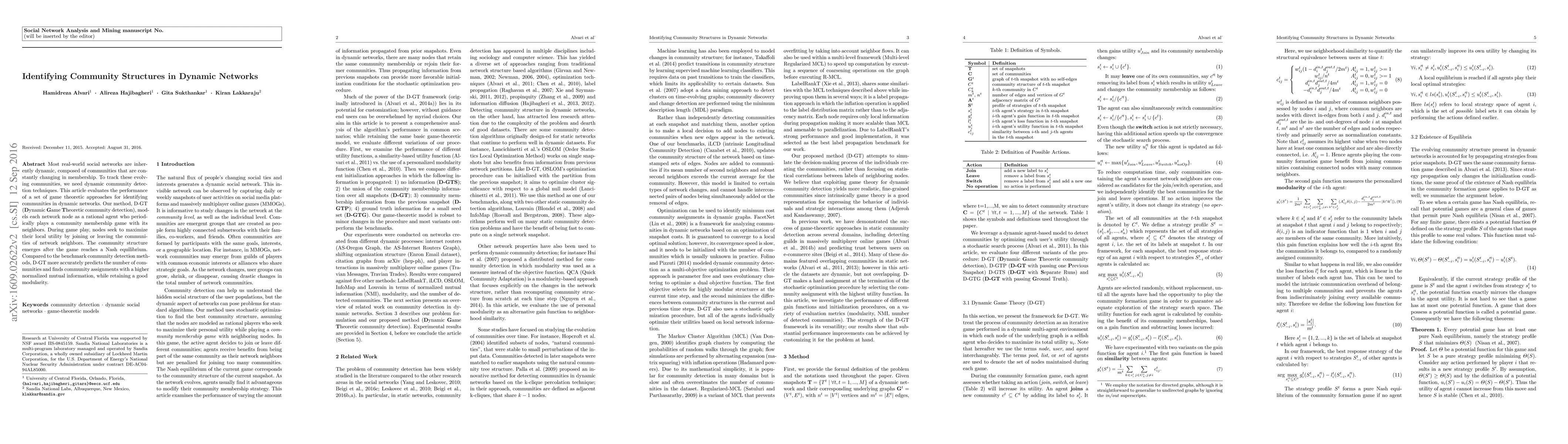 This paper evaluates game theoretic approaches for dynamic community detection in evolving networks. The proposed D-GT method models nodes as rational agents playing a community membership game, achieving a Nash equilibrium to identify communities, which outperforms benchmark methods in terms of accuracy and modularity.
