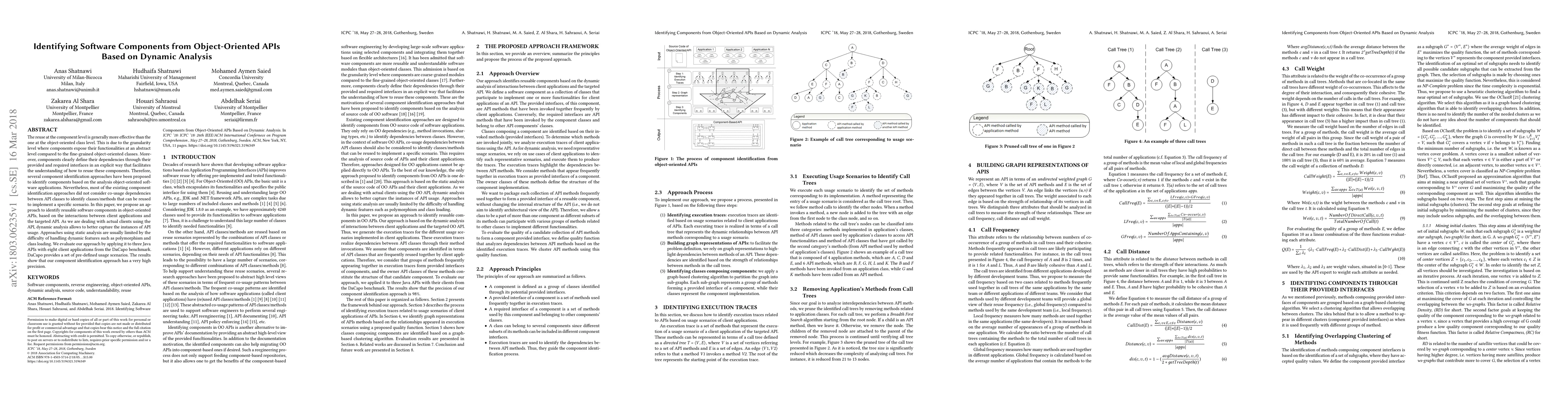 This paper proposes a dynamic analysis approach to identify reusable software components in object-oriented APIs by analyzing interactions between client applications and the API. The method captures actual API usage, achieving high precision in identifying components, as demonstrated through evaluation on three Java APIs using DaCapo benchmark scenarios.