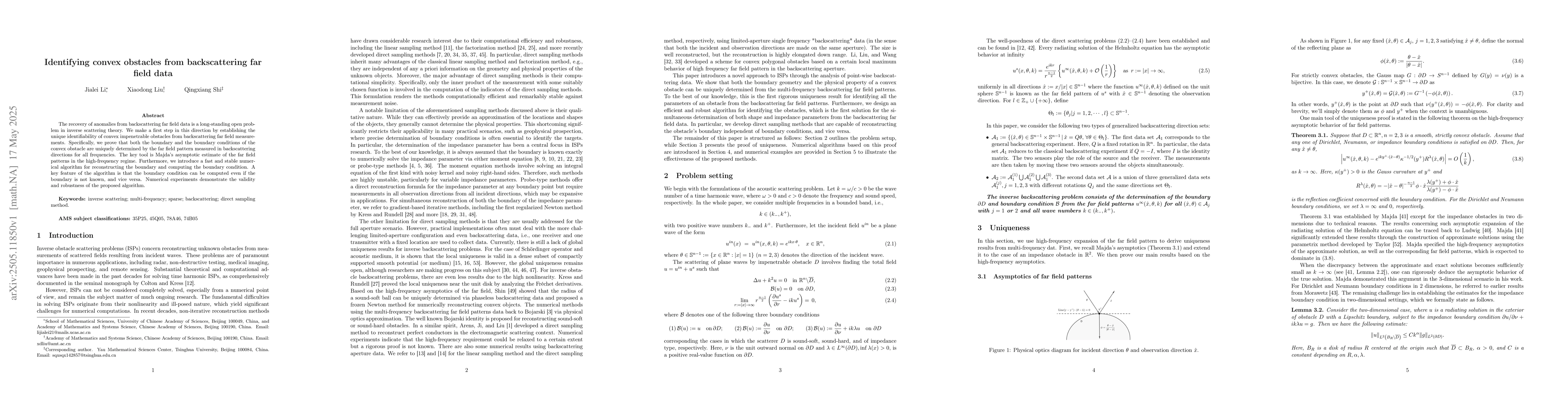 The research establishes unique identifiability of convex impenetrable obstacles from backscattering far field measurements using Majda's asymptotic estimate in the high-frequency regime.