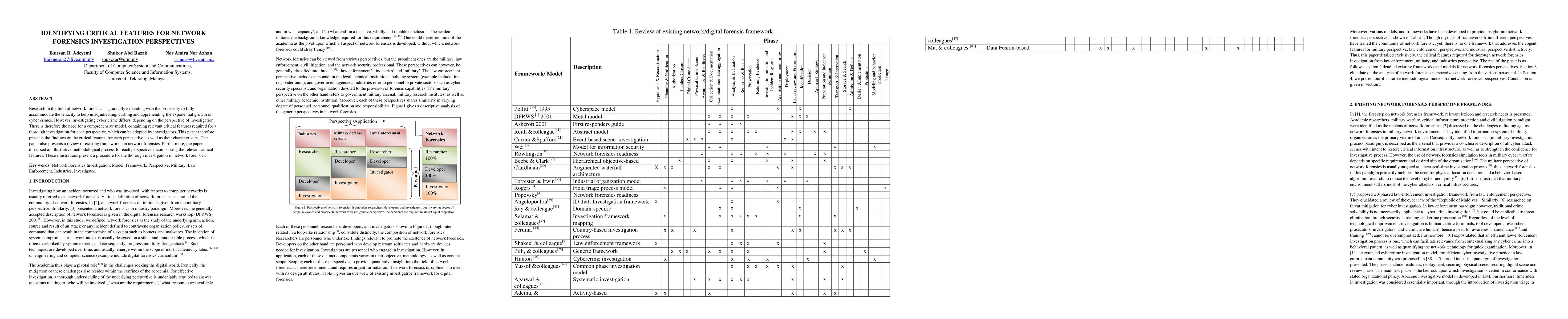 This paper identifies critical features essential for network forensics investigations from various perspectives, presenting a comprehensive model for each. It reviews existing frameworks and outlines a methodological process for thorough investigations, aiding investigators in adjudicating and curbing cyber crimes.