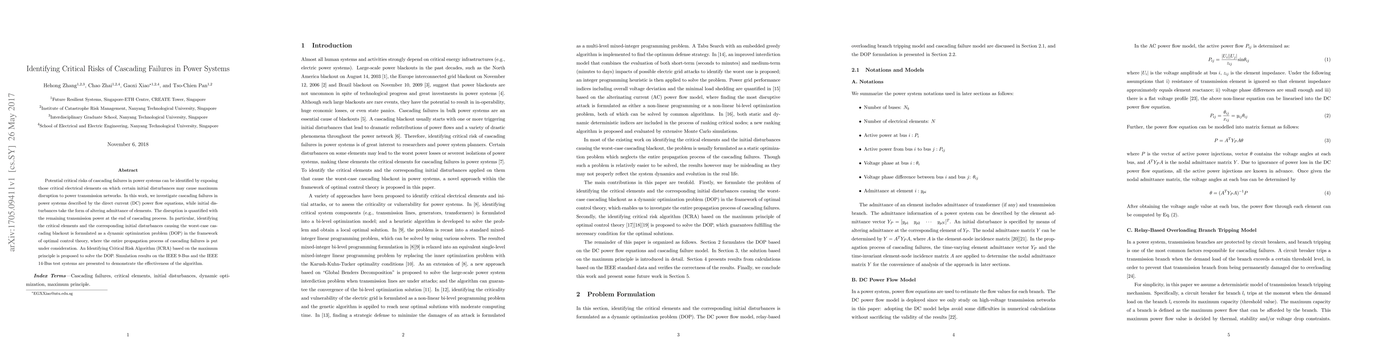 This paper identifies critical risks of cascading failures in power systems by analyzing the impact of initial disturbances on electrical elements using DC power flow equations. It formulates the worst-case cascading blackout as a dynamic optimization problem and proposes an Identifying Critical Risk Algorithm (ICRA) based on optimal control theory to solve it, demonstrating effectiveness through simulations on IEEE 9-Bus and 14-Bus systems.
