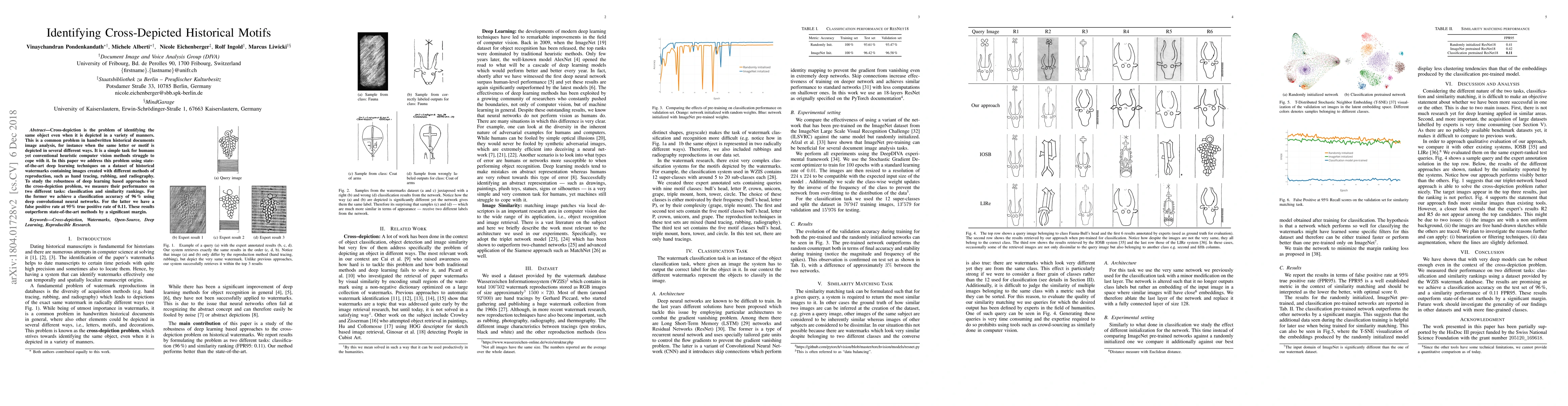 Cross-depiction is the problem of identifying the same object even when it is depicted in a variety of manners. This is a common problem in handwritten historical documents image analysis, for instance when the same letter or motif is depicted in several different ways. It is a simple task for humans yet conventional heuristic computer vision methods struggle to cope with it. In this paper we address this problem using state-of-the-art deep learning techniques on a dataset of historical watermarks containing images created with different methods of reproduction, such as hand tracing, rubbing, and radiography. To study the robustness of deep learning based approaches to the cross-depiction problem, we measure their performance on two different tasks: classification and similarity rankings. For the former we achieve a classification accuracy of 96% using deep convolutional neural networks. For the latter we have a false positive rate at 95% true positive rate of 0.11. These results outperform state-of-the-art methods by a significant margin.