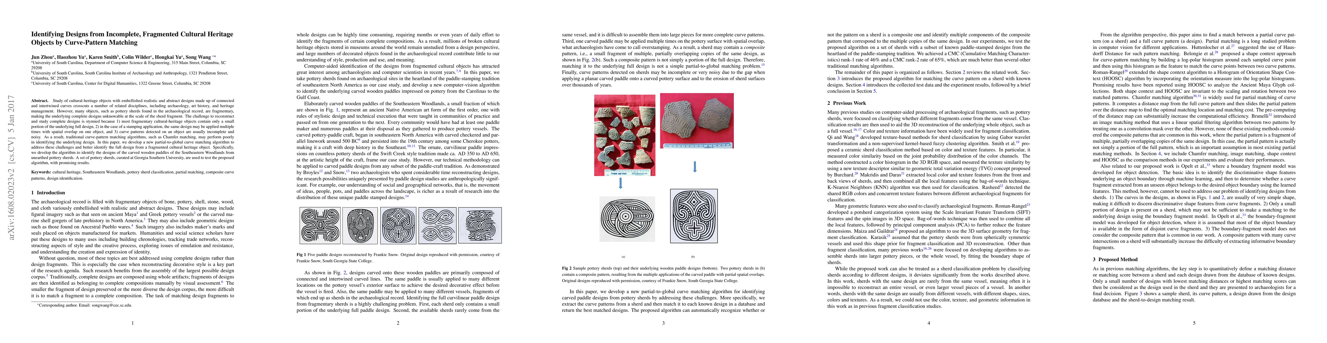 Study of cultural-heritage objects with embellished realistic and abstract designs made up of connected and intertwined curves crosscuts a number of related disciplines, including archaeology, art history, and heritage management. However, many objects, such as pottery sherds found in the archaeological record, are fragmentary, making the underlying complete designs unknowable at the scale of the sherd fragment. The challenge to reconstruct and study complete designs is stymied because 1) most fragmentary cultural-heritage objects contain only a small portion of the underlying full design, 2) in the case of a stamping application, the same design may be applied multiple times with spatial overlap on one object, and 3) curve patterns detected on an object are usually incomplete and noisy. As a result, classical curve-pattern matching algorithms, such as Chamfer matching, may perform poorly in identifying the underlying design. In this paper, we develop a new partial-to-global curve matching algorithm to address these challenges and better identify the full design from a fragmented cultural heritage object. Specifically, we develop the algorithm to identify the designs of the carved wooden paddles of the Southeastern Woodlands from unearthed pottery sherds. A set of pottery sherds from the Snow Collection, curated at Georgia Southern University, are used to test the proposed algorithm, with promising results.
