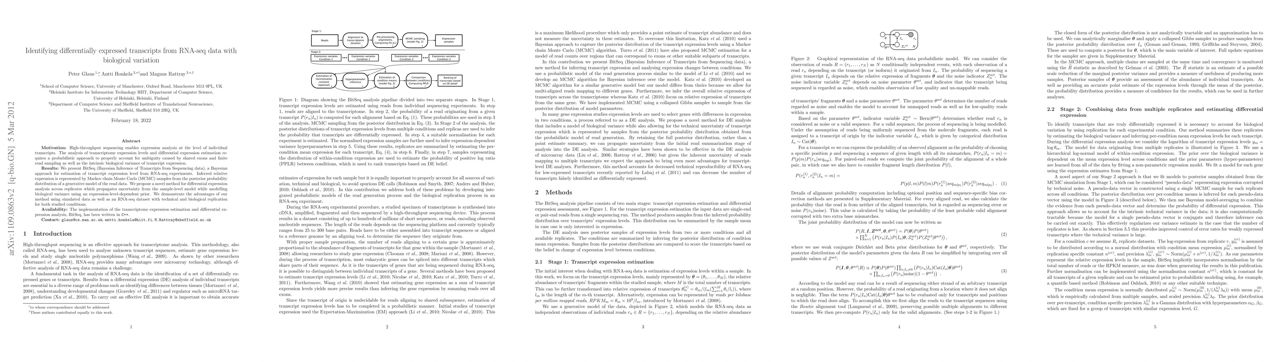 This paper introduces BitSeq, a Bayesian method for estimating transcript expression levels from RNA-seq data, addressing biological variance and shared exons. It demonstrates improved differential expression analysis across replicates using simulated and real RNA-seq datasets.