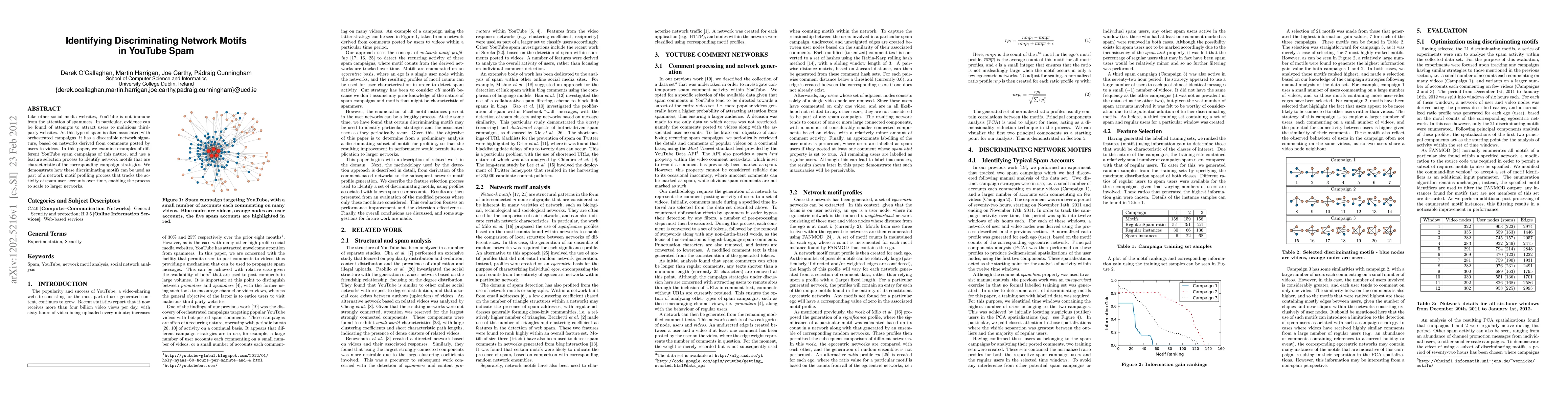 This paper investigates YouTube spam campaigns by analyzing comment networks to identify distinctive network motifs. It demonstrates how these motifs can profile and track spam accounts, facilitating scalable detection in larger networks.