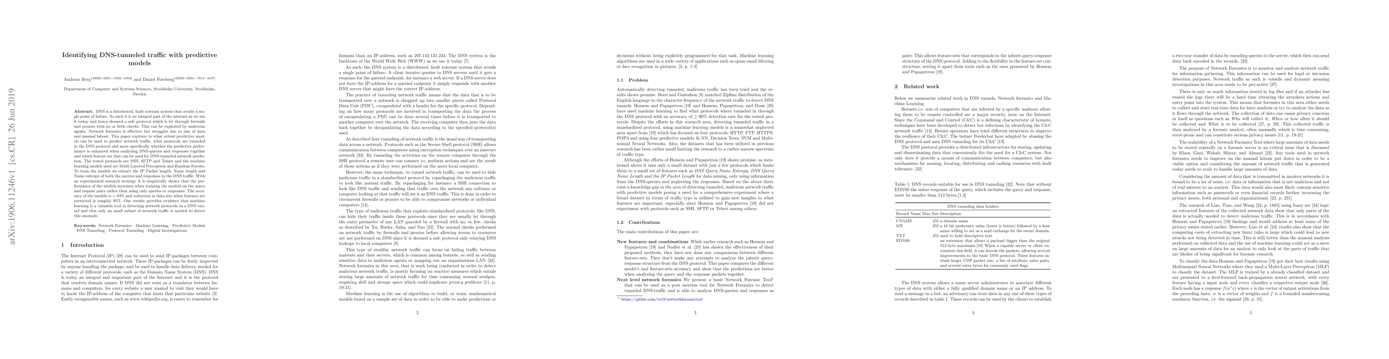 This paper explores using predictive models to identify DNS-tunneled traffic, showing that machine learning can effectively detect network protocols with high accuracy and a small dataset.