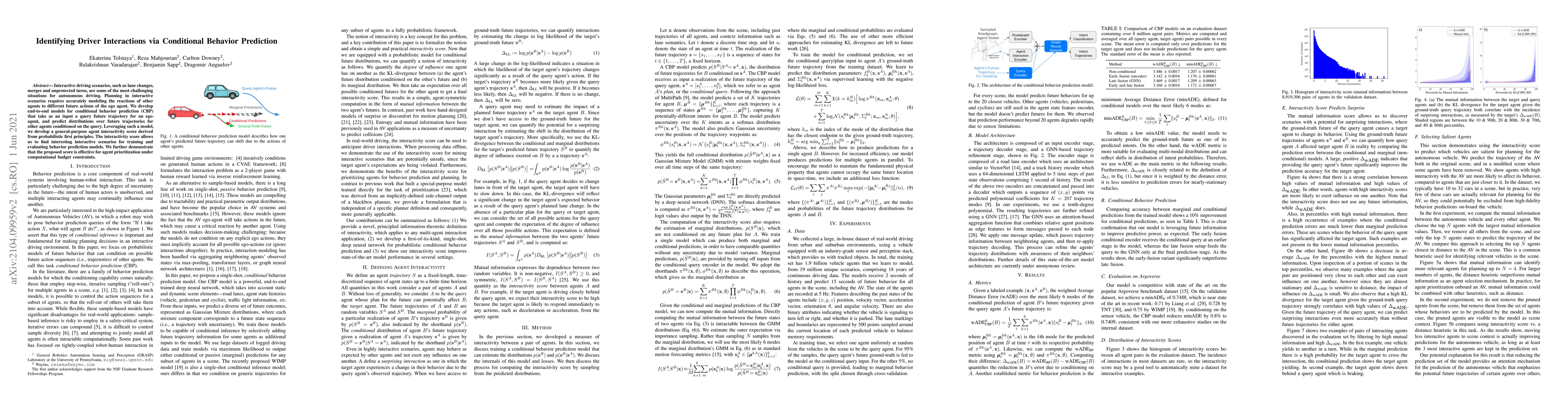 Interactive driving scenarios, such as lane changes, merges and unprotected turns, are some of the most challenging situations for autonomous driving. Planning in interactive scenarios requires accurately modeling the reactions of other agents to different future actions of the ego agent. We develop end-to-end models for conditional behavior prediction (CBP) that take as an input a query future trajectory for an ego-agent, and predict distributions over future trajectories for other agents conditioned on the query. Leveraging such a model, we develop a general-purpose agent interactivity score derived from probabilistic first principles. The interactivity score allows us to find interesting interactive scenarios for training and evaluating behavior prediction models. We further demonstrate that the proposed score is effective for agent prioritization under computational budget constraints.