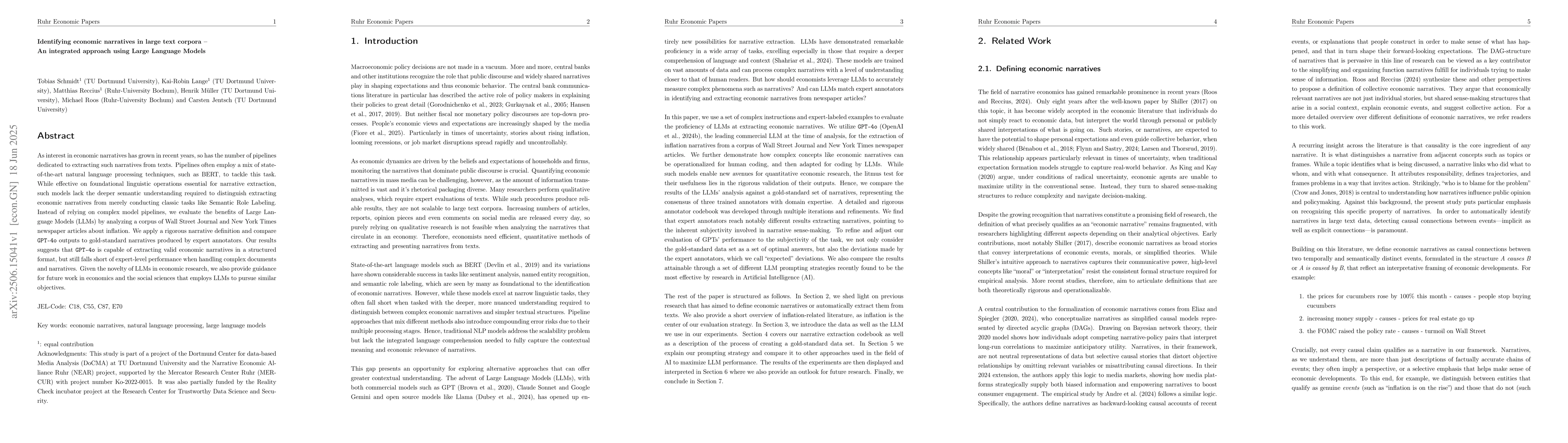 As interest in economic narratives has grown in recent years, so has the number of pipelines dedicated to extracting such narratives from texts. Pipelines often employ a mix of state-of-the-art natural language processing techniques, such as BERT, to tackle this task. While effective on foundational linguistic operations essential for narrative extraction, such models lack the deeper semantic understanding required to distinguish extracting economic narratives from merely conducting classic tasks like Semantic Role Labeling. Instead of relying on complex model pipelines, we evaluate the benefits of Large Language Models (LLMs) by analyzing a corpus of Wall Street Journal and New York Times newspaper articles about inflation. We apply a rigorous narrative definition and compare GPT-4o outputs to gold-standard narratives produced by expert annotators. Our results suggests that GPT-4o is capable of extracting valid economic narratives in a structured format, but still falls short of expert-level performance when handling complex documents and narratives. Given the novelty of LLMs in economic research, we also provide guidance for future work in economics and the social sciences that employs LLMs to pursue similar objectives.