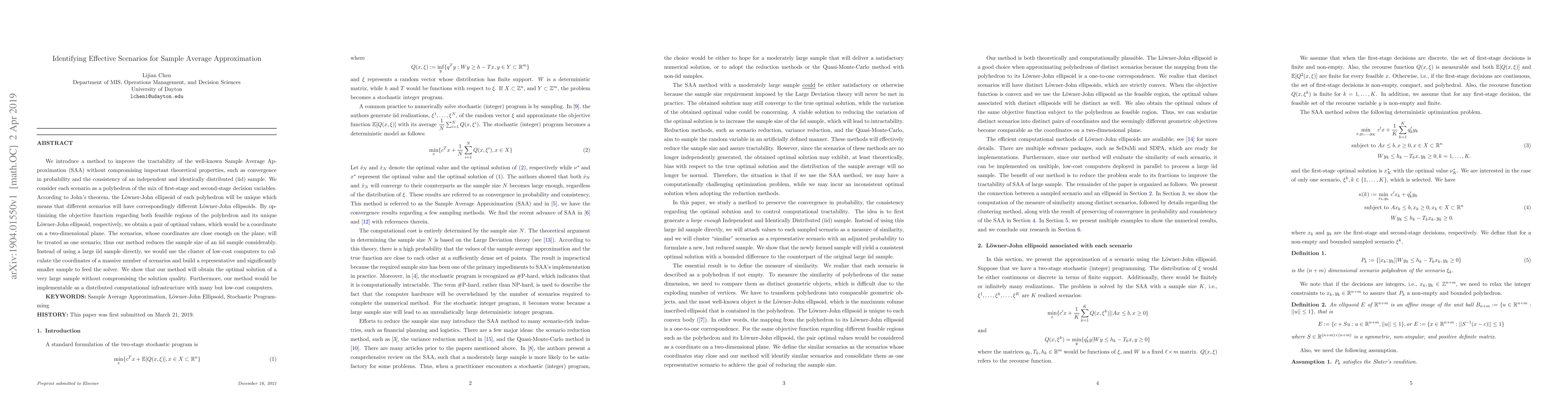 We introduce a method to improve the tractability of the well-known Sample Average Approximation (SAA) without compromising important theoretical properties, such as convergence in probability and the consistency of an independent and identically distributed (iid) sample. We consider each scenario as a polyhedron of the mix of first-stage and second-stage decision variables. According to John's theorem, the Lowner-John ellipsoid of each polyhedron will be unique which means that different scenarios will have correspondingly different Lowner-John ellipsoids. By optimizing the objective function regarding both feasible regions of the polyhedron and its unique Lowner-John ellipsoid, respectively, we obtain a pair of optimal values, which would be a coordinate on a two-dimensional plane. The scenarios, whose coordinates are close enough on the plane, will be treated as one scenario; thus our method reduces the sample size of an iid sample considerably. Instead of using a large iid sample directly, we would use the cluster of low-cost computers to calculate the coordinates of a massive number of scenarios and build a representative and significantly smaller sample to feed the solver. We show that our method will obtain the optimal solution of a very large sample without compromising the solution quality. Furthermore, our method would be implementable as a distributed computational infrastructure with many but low-cost computers.