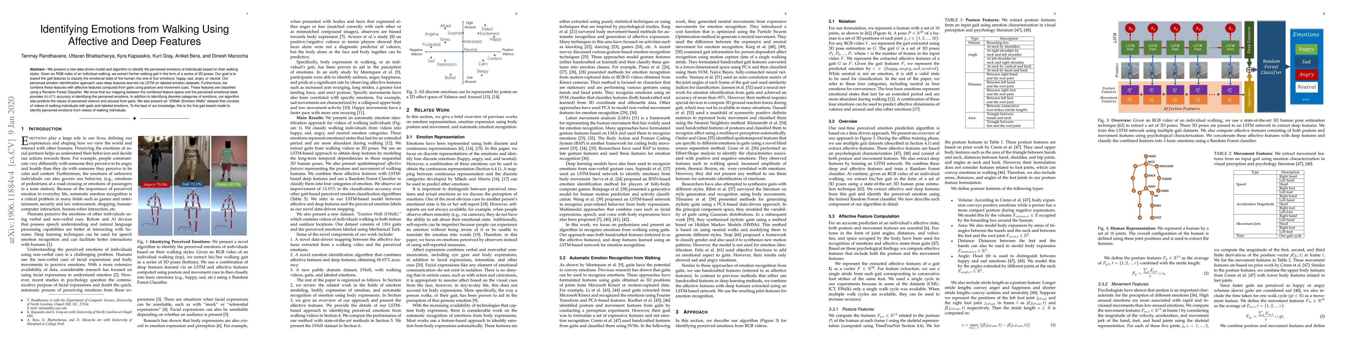 This work is the first to identify perceived emotions from walking videos using a combination of deep and affective features, offering improved accuracy over existing methods.