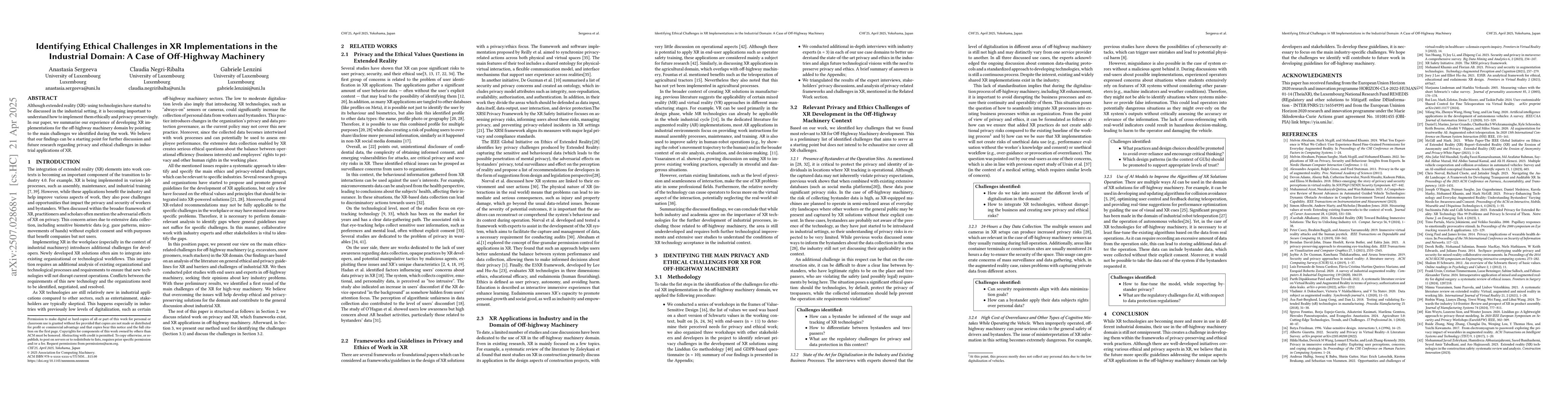 Although extended reality(XR)-using technologies have started to be discussed in the industrial setting, it is becoming important to understand how to implement them ethically and privacy-preservingly. In our paper, we summarise our experience of developing XR implementations for the off-highway machinery domain by pointing to the main challenges we identified during the work. We believe that our findings can be a starting point for further discussion and future research regarding privacy and ethical challenges in industrial applications of XR.