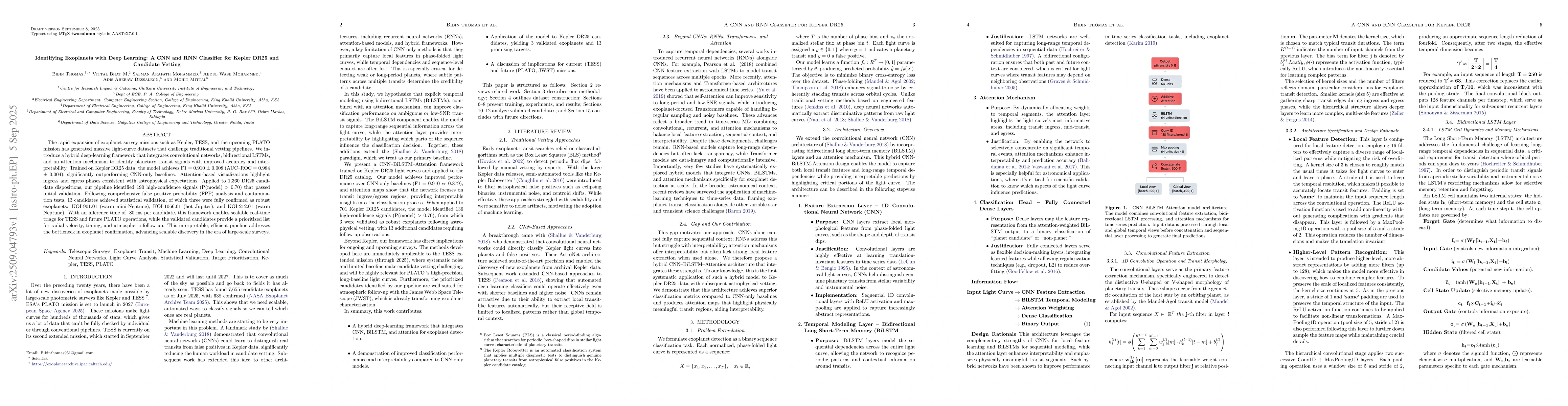 The rapid expansion of exoplanet survey missions such as Kepler, TESS, and the upcoming PLATO mission has generated massive light-curve datasets that challenge traditional vetting pipelines. We introduce a hybrid deep-learning framework that integrates convolutional networks, bidirectional LSTMs, and an attention mechanism to identify planetary transit signals with improved accuracy and interpretability. Trained on Kepler DR25 data, the model achieves F1 = $0.910 \pm 0.008$ (AUC--ROC = $0.984 \pm 0.004$), significantly outperforming CNN-only baselines. Attention-based visualizations highlight ingress and egress phases consistent with astrophysical expectations. Applied to 1,360 DR25 candidate dispositions, our pipeline identified 190 high-confidence signals (P(model) $<$ 0.70) that passed initial validation. Following comprehensive false positive probability (FPP) analysis and contamination tests, 13 candidates achieved statistical validation, of which three were fully confirmed as robust exoplanets: KOI-901.01 (warm mini-Neptune), KOI-1066.01 (hot Jupiter), and KOI-212.01 (warm Neptune). With an inference time of $\sim 80$ ms per candidate, this framework enables scalable real-time triage for TESS and future PLATO operations, while the validated candidates provide a prioritized list for radial velocity, timing, and atmospheric follow-up. This interpretable, efficient pipeline addresses the bottleneck in exoplanet confirmation, advancing scalable discovery in the era of large-scale surveys.