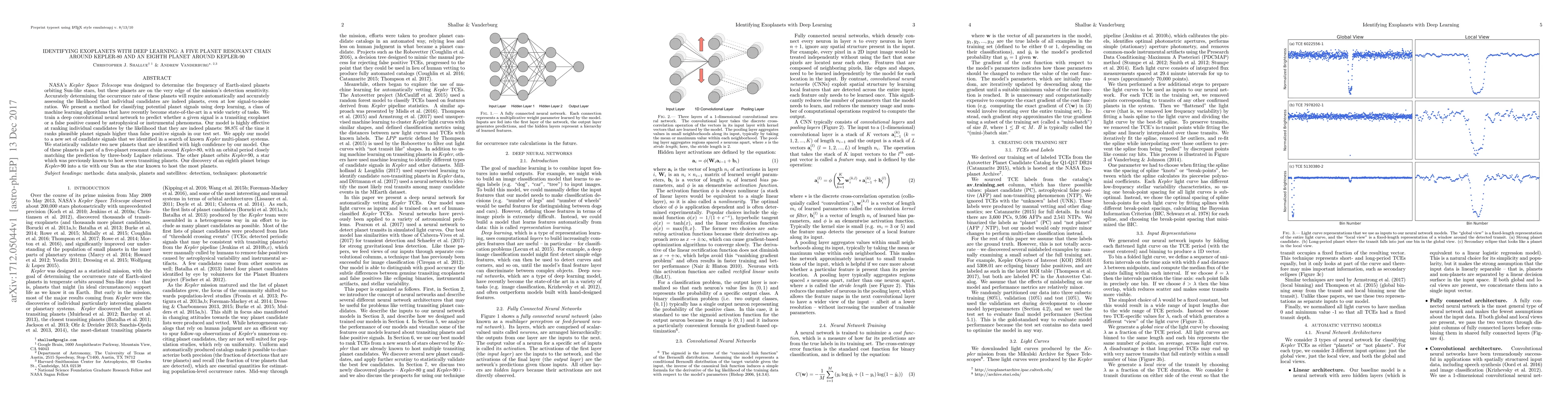 This paper introduces a deep learning method to classify potential exoplanet signals from the Kepler Space Telescope, achieving 98.8% accuracy in distinguishing true planets from false positives. The model successfully identifies two new planets, including a fifth planet in a resonant chain around Kepler-80 and an eighth planet around Kepler-90, tying it with our Sun for the most known planets orbiting a single star.