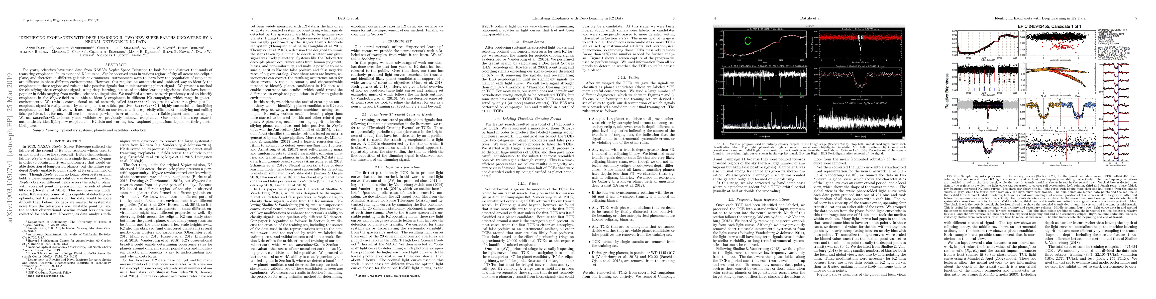 For years, scientists have used data from NASA's Kepler Space Telescope to look for and discover thousands of transiting exoplanets. In its extended K2 mission, Kepler observed stars in various regions of sky all across the ecliptic plane, and therefore in different galactic environments. Astronomers want to learn how the population of exoplanets are different in these different environments. However, this requires an automatic and unbiased way to identify the exoplanets in these regions and rule out false positive signals that mimic transiting planet signals. We present a method for classifying these exoplanet signals using deep learning, a class of machine learning algorithms that have become popular in fields ranging from medical science to linguistics. We modified a neural network previously used to identify exoplanets in the Kepler field to be able to identify exoplanets in different K2 campaigns, which range in galactic environments. We train a convolutional neural network, called AstroNet-K2, to predict whether a given possible exoplanet signal is really caused by an exoplanet or a false positive. AstroNet-K2 is highly successful at classifying exoplanets and false positives, with accuracy of 98% on our test set. It is especially efficient at identifying and culling false positives, but for now, still needs human supervision to create a complete and reliable planet candidate sample. We use AstroNet-K2 to identify and validate two previously unknown exoplanets. Our method is a step towards automatically identifying new exoplanets in K2 data and learning how exoplanet populations depend on their galactic birthplace.