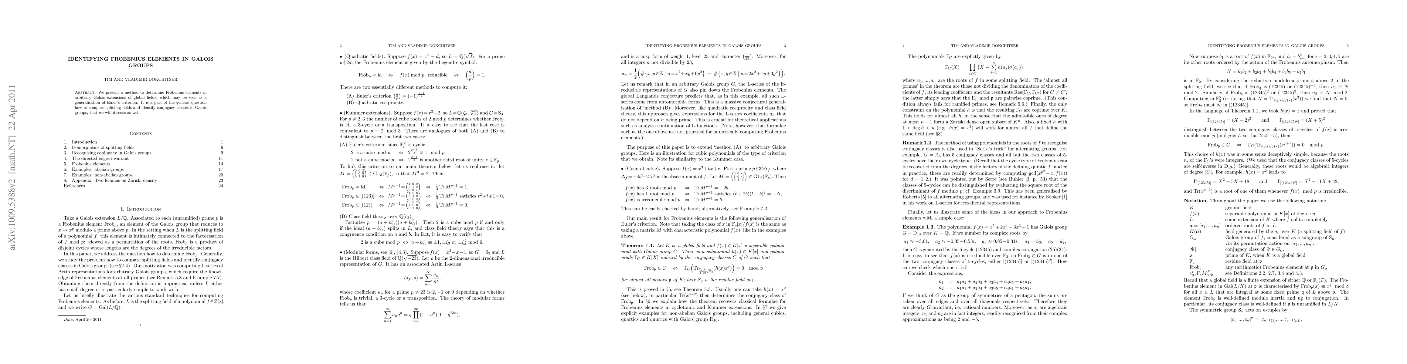 This paper presents a novel method for identifying Frobenius elements in Galois groups of global field extensions, generalizing Euler's criterion, and discusses the broader context of comparing splitting fields and conjugacy classes in Galois groups.