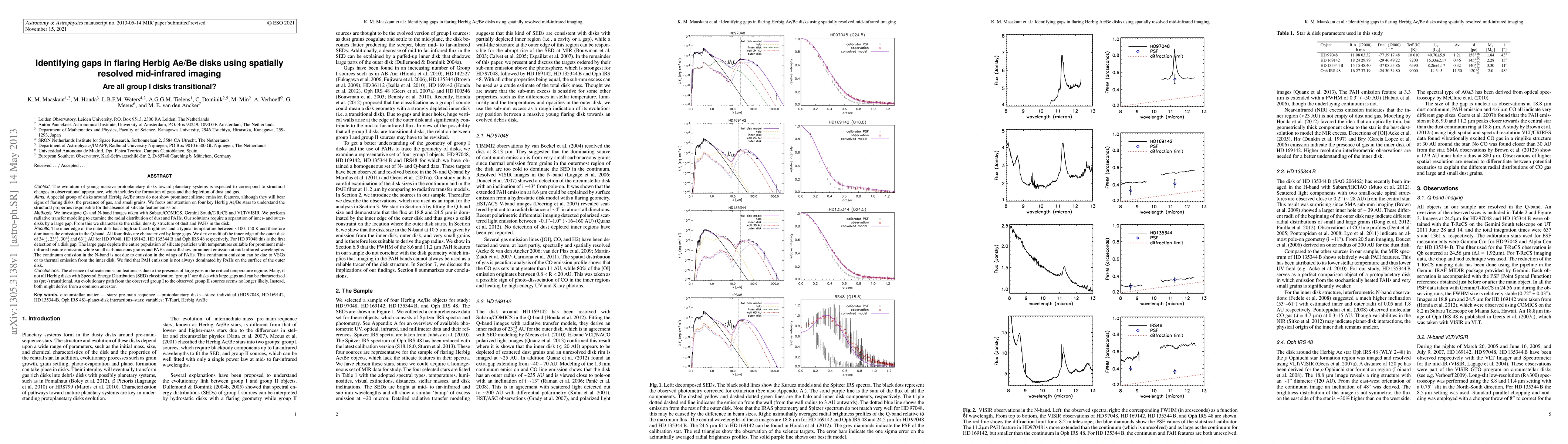 *Context The evolution of young massive protoplanetary disks toward planetary systems is expected to include the formation of gaps and the depletion of dust and gas. *Aims A special group of flaring disks around Herbig Ae/Be stars do not show prominent silicate emission features. We focus our attention on four key Herbig Ae/Be stars to understand the structural properties responsible for the absence of silicate feature emission. *Methods We investigate Q- and N-band images taken with Subaru/COMICS, Gemini South/T-ReCS and VLT/VISIR. Our radiative transfer modeling solutions require a separation of inner- and outer- disks by a large gap. From this we characterize the radial density structure of dust and PAHs in the disk. *Results The inner edge of the outer disk has a high surface brightness and a typical temperature between ~100-150 K and therefore dominates the emission in the Q-band. We derive radii of the inner edge of the outer disk of 34, 23, 30 and 63 AU for HD97048, HD169142, HD135344B and Oph IRS 48 respectively. For HD97048 this is the first detection of a disk gap. The continuum emission in the N-band is not due to emission in the wings of PAHs. This continuum emission can be due to VSGs or to thermal emission from the inner disk. We find that PAH emission is not always dominated by PAHs on the surface of the outer disk. *Conclusions. The absence of silicate emission features is due to the presence of large gaps in the critical temperature regime. Many, if not all Herbig disks with Spectral Energy Distribution (SED) classification `group I' are disks with large gaps and can be characterized as (pre-) transitional. An evolutionary path from the observed group I to the observed group II sources seems no longer likely. Instead, both might derive from a common ancestor.