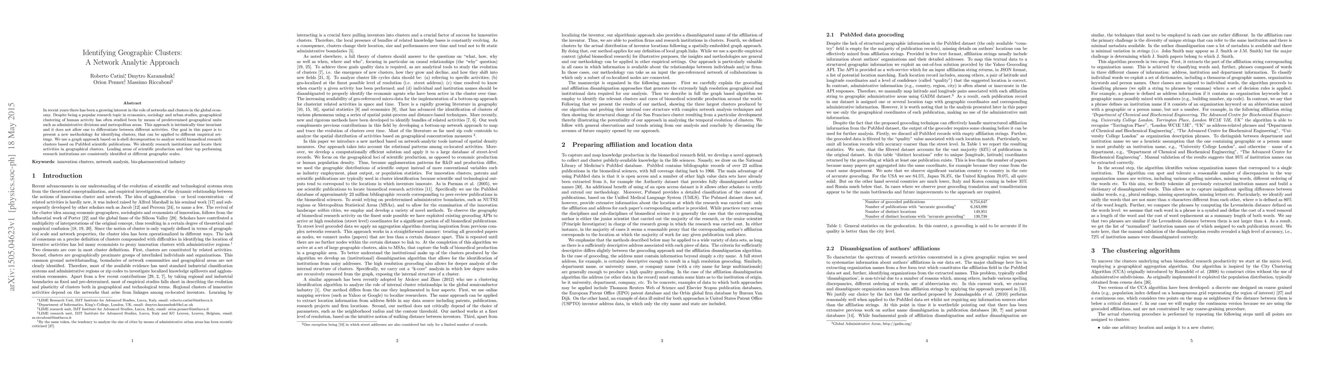 This paper introduces a novel network analytic method using k-shell decomposition to identify geographic clusters of biomedical research institutions based on PubMed publications, offering a flexible approach that transcends traditional administrative boundaries. This method consistently highlights leading research areas and top institutions across various geographic scales.