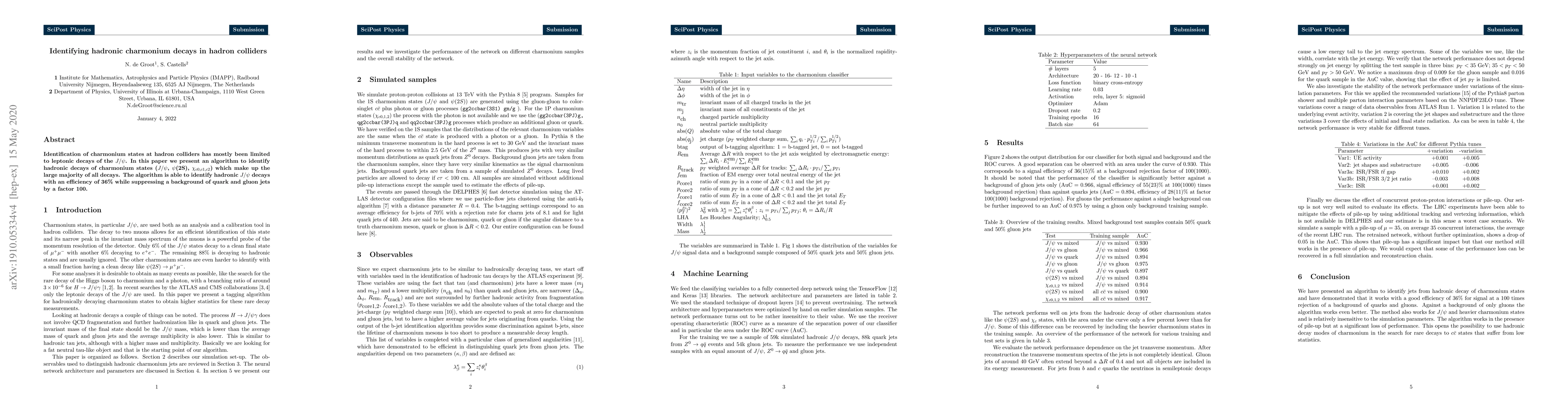 This paper introduces an algorithm to identify hadronic decays of charmonium states, including J/ψ, ψ(2S), and χc0,1,2, which significantly outnumber leptonic decays. The method achieves a 36% efficiency for hadronic J/ψ decay identification while reducing background quark and gluon jets by a factor of 100.