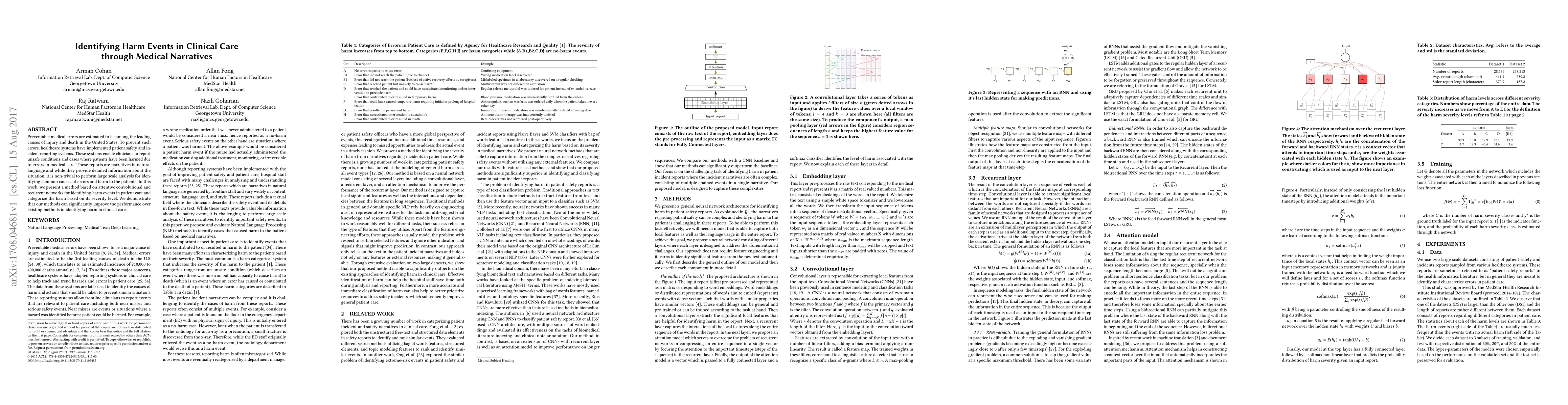 This paper proposes a method using attentive convolutional and recurrent neural networks to identify and categorize harm events in clinical care from medical narratives. The approach demonstrates improved performance over existing methods in detecting and classifying patient harm due to medical errors.