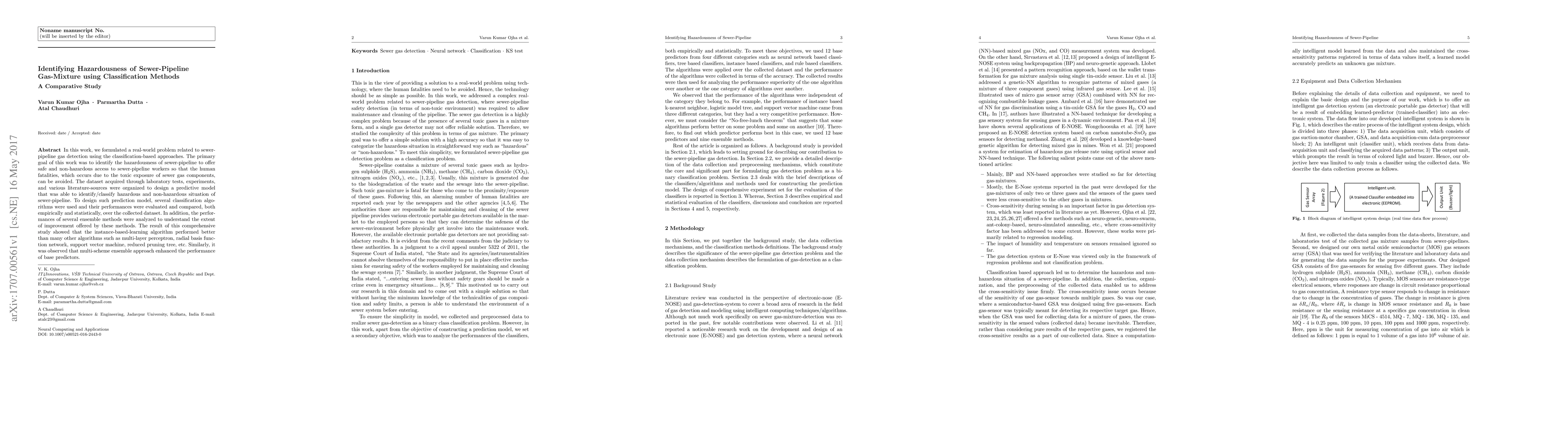 In this work, we formulated a real-world problem related to sewer pipeline gas detection using the classification-based approaches. The primary goal of this work was to identify the hazardousness of sewer pipeline to offer safe and non-hazardous access to sewer pipeline workers so that the human fatalities, which occurs due to the toxic exposure of sewer gas components, can be avoided. The dataset acquired through laboratory tests, experiments, and various literature sources was organized to design a predictive model that was able to identify/classify hazardous and non-hazardous situation of sewer pipeline. To design such prediction model, several classification algorithms were used and their performances were evaluated and compared, both empirically and statistically, over the collected dataset. In addition, the performances of several ensemble methods were analyzed to understand the extent of improvement offered by these methods. The result of this comprehensive study showed that the instance-based learning algorithm performed better than many other algorithms such as multilayer perceptron, radial basis function network, support vector machine, reduced pruning tree. Similarly, it was observed that multi-scheme ensemble approach enhanced the performance of base predictors.